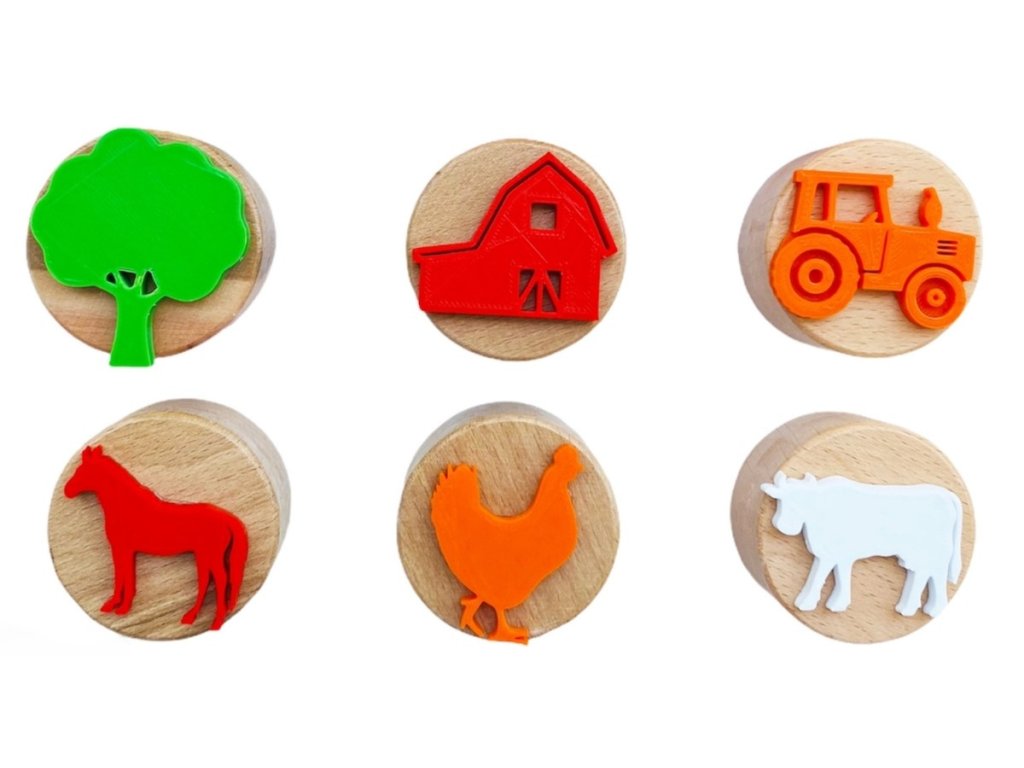 Sada dřevěných razítek Farma přenese děti do světa plného fantazie, tvoření a zvířátek. Razítkování je pro malé děti přirozenou a hravou cestou, jak rozvíjet jemnou motoriku, koordinaci ruky a oka i představivost. Každý otisk otevírá prostor pro nové nápady, příběhy a objevování.