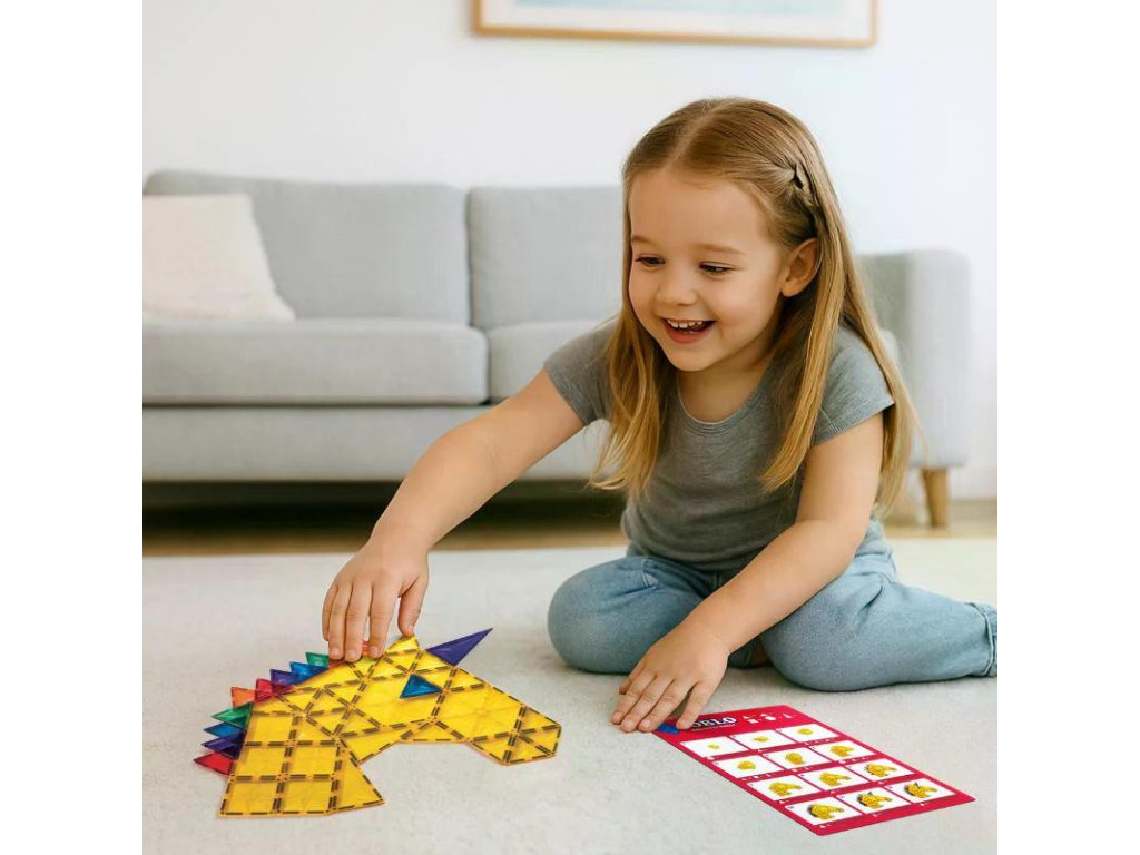 Karty podporují vizuální vnímání i prostorovou představivost. Děti si nejprve obrázek pozorně prohlédnou a pak se ho snaží ze stavebnice znovu postavit. Tím trénují paměť, rozpoznávání barev a tvarů i schopnost plánovat jednotlivé kroky. Když se jim podaří model úspěšně zopakovat, přichází zasloužený pocit úspěchu, který posiluje jejich sebevědomí. Součástí balení je arch samolepek s 30 pohyblivými očky - stačí je nalepit a sledovat, jak stavby dostávají svůj vlastní charakter.