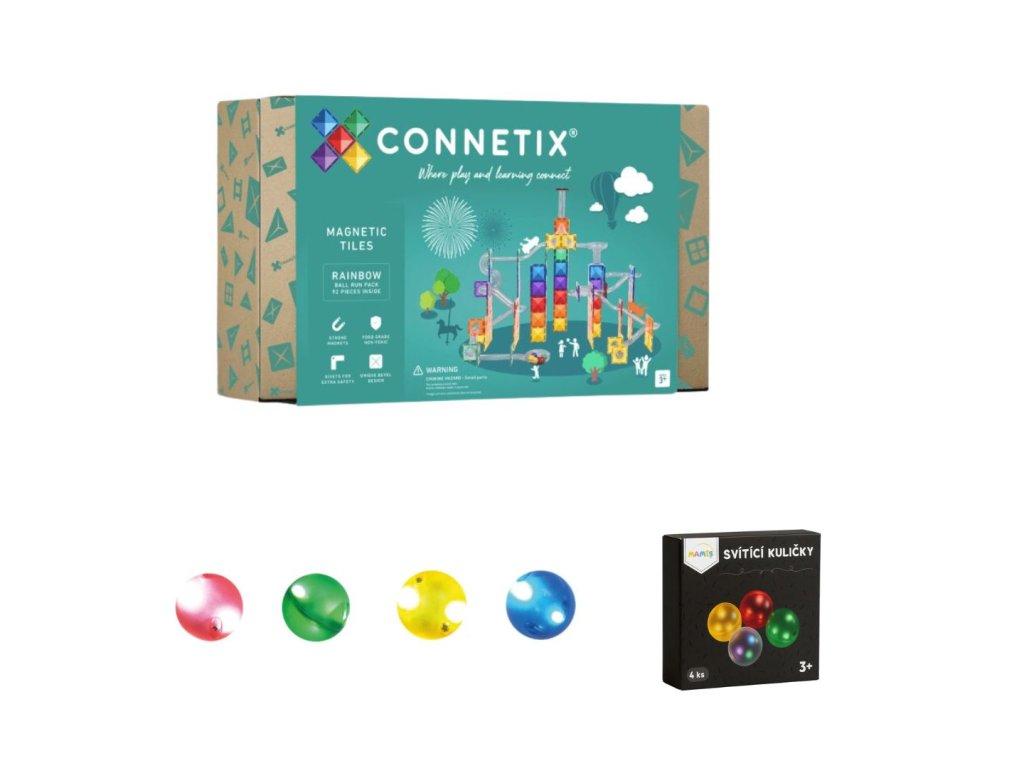 Zvýhodněna sada magnetické kuličkodráhy Connetix Tiles (92 ks), rozšíření pro kuličkodráhy (66 ks) a svítících kuliček Mamis (4 ks). Vhodné od 3 let.