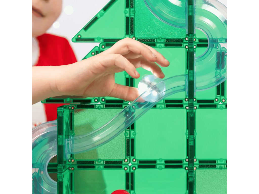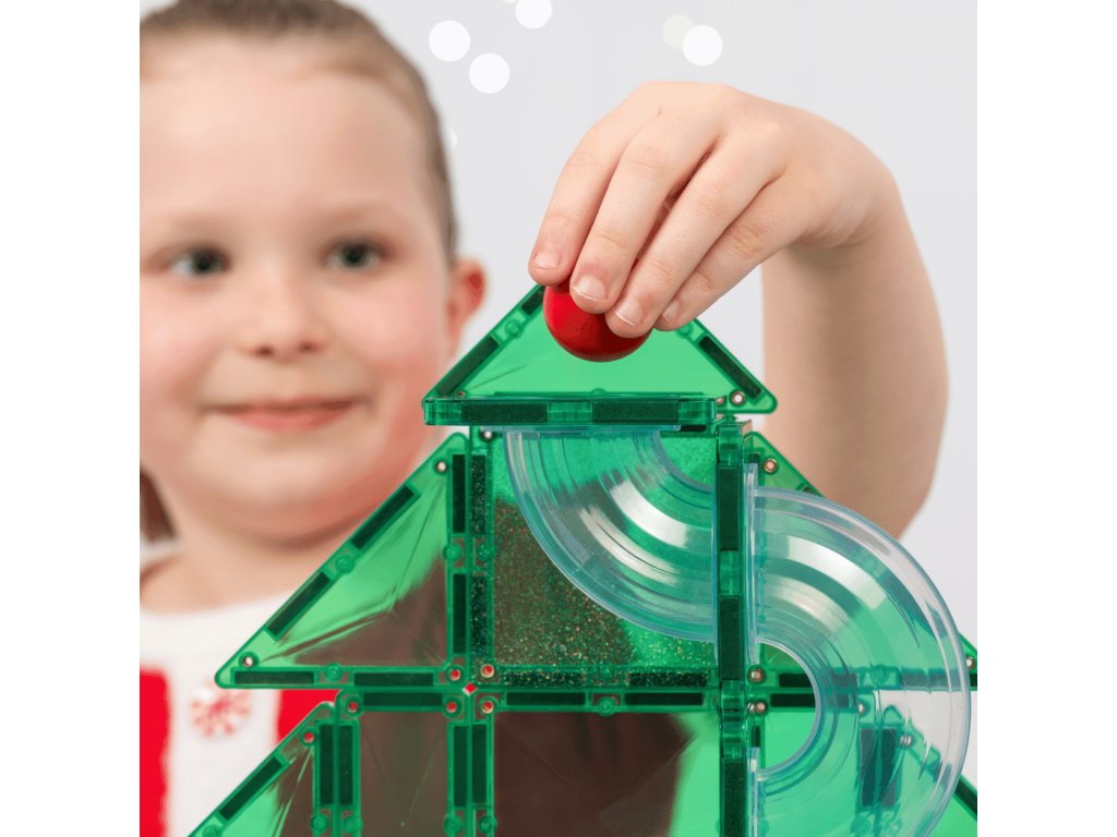 Tato limitovaná edice přináší průhledné žebrované trubičky v krásných vánočních barvách a v různých tvarech, jako jsou rovné díly, klouzačky i spirály. Spolu s výběrem magnetických dílků a třpytivých zelených dlaždic si děti mohou postavit vlastní zářící vánoční stromek a užít si kouzlo točících se kuliček. A co je nejlepší, stavebnici lze každý rok znovu postavit a vytvořit pokaždé jinou podobu. Anebo ji můžete použít i na další hraní, protože díly jsou navzájem kompatibilní i s dalšími sety od Connetix, Magna Tiles a další.Součástí balení jsou dřevěné kuličky i jedna světélkující kulička. Pokud potřebujete více svítících kuliček, doporučujeme dokoupit kuličky i zvlášť.
