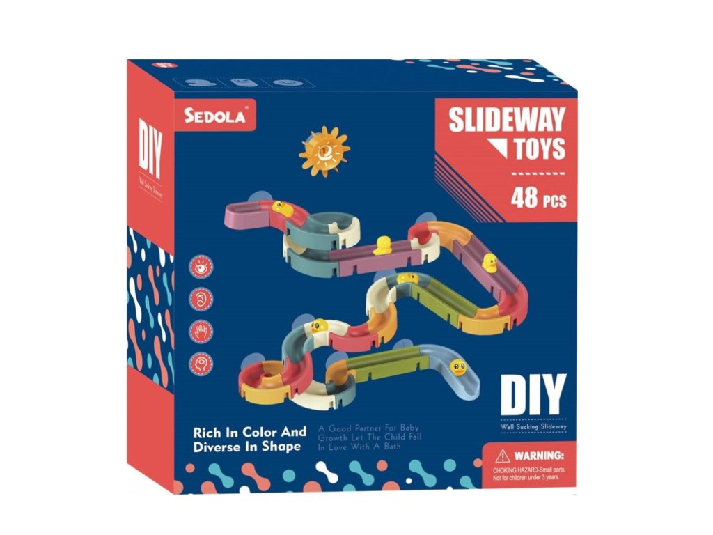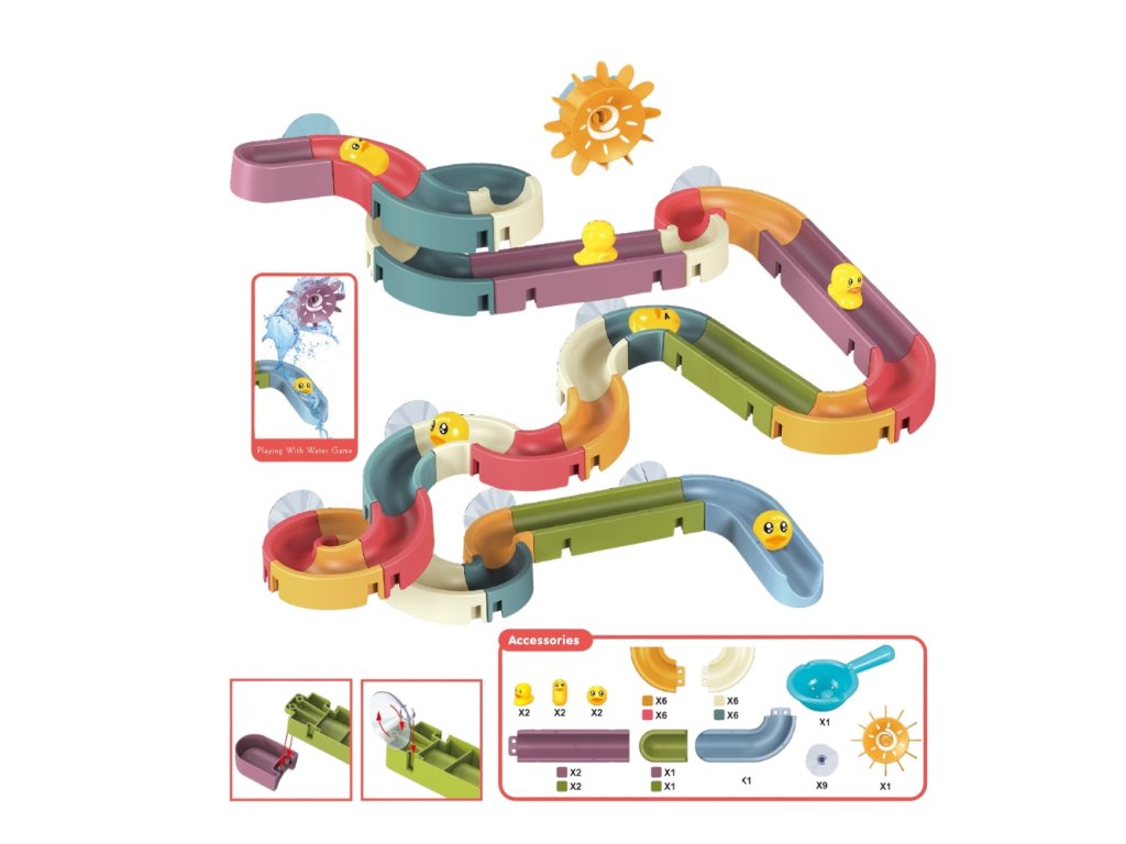 Díky 48 dílkům si děti snadno sestaví originální skluzavku podle své fantazie. Součástí balení jsou malé kuličky i roztomilé kačenky, které se po dráze pohybují a přinášejí ještě více radosti ze hry. Děti sledují jejich cestu, zkoušejí různé varianty uspořádání a hravou formou objevují principy pohybu, rychlosti i příčiny a následku.