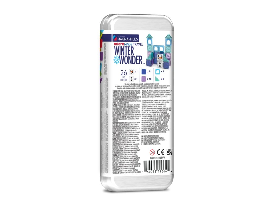 Magnetická stavebnice Magna Tiles v zimní motivu. Sada obsahuje díly MicroMags, které jsou o 75% menší než klasické díly. Díky tomu přináší další možnost jak ozvláštnit stavby a potrénovat jemnou motoriku. Tato stavebnice je navíc v praktickém kovovém balení, takže je vhodná i na cesty. Nezabere místo, magnetické díly jsou bezpečně uchované, aby se neztratily. A děti si tak mohou stavět klidně i v letadle, vlaku nebo na hotelu. Sada skvěle doplňuje další magnetické stavebnice od Magna tiles. Kombinovat ji můžete také s magnetickou stavebnicí Connetix, Coblo, MiDeer, Magbrix Learn & Grow nebo třeba MNTL.