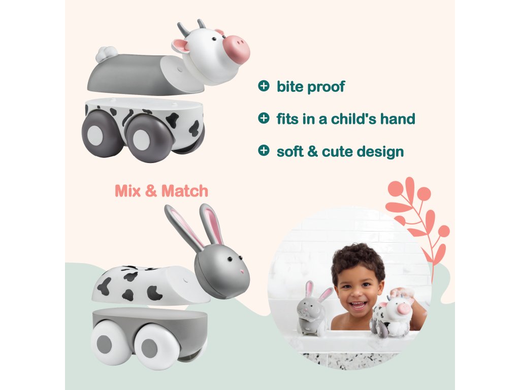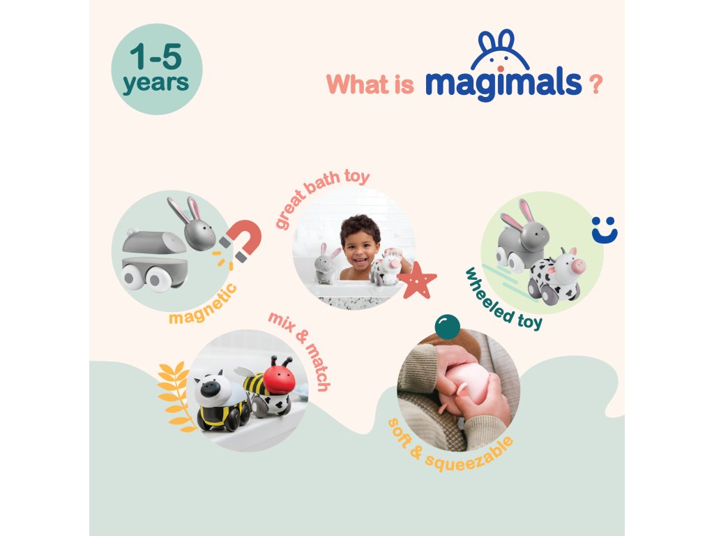 Roztomilá magnetická zvířátka Magimals Wheely, která přinášejí dětem zábavu a zároveň rozvíjí první motorické dovednosti i přirozenou zvídavost. Beruška a včela mají pevně uchycená kolečka, takže se snadno kutálejí a děti mohou sledovat jejich pohyb, spojovat je pomocí magnetů nebo je mačkat v ručičkách. Díky kvalitnímu zpracování, bezpečným materiálům a zaobleným hranám jsou ideální i pro nejmenší objevitele – doma, na podlaze i přímo ve vaně, protože jsou voděodolné.