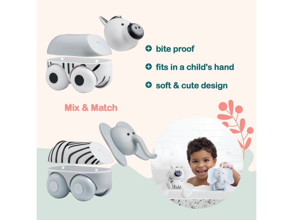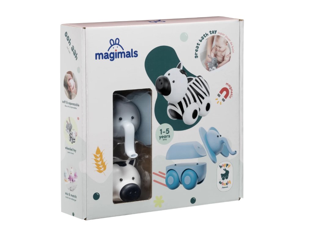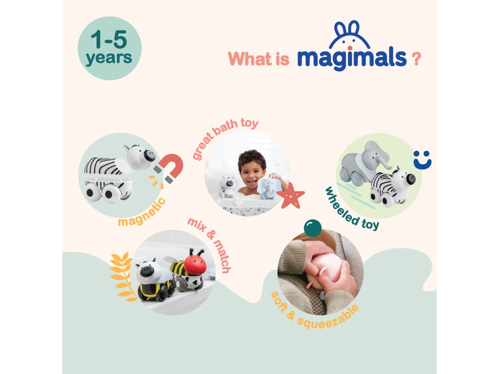 Roztomilá magnetická zvířátka Magimals Wheely, která přinášejí dětem zábavu a zároveň rozvíjí první motorické dovednosti i přirozenou zvídavost. Zebra a slon mají pevně uchycená kolečka, takže se snadno kutálejí a děti mohou sledovat jejich pohyb, spojovat je pomocí magnetů nebo je mačkat v ručičkách. Díky kvalitnímu zpracování, bezpečným materiálům a zaobleným hranám jsou ideální i pro nejmenší objevitele – doma, na podlaze i přímo ve vaně, protože jsou voděodolné.