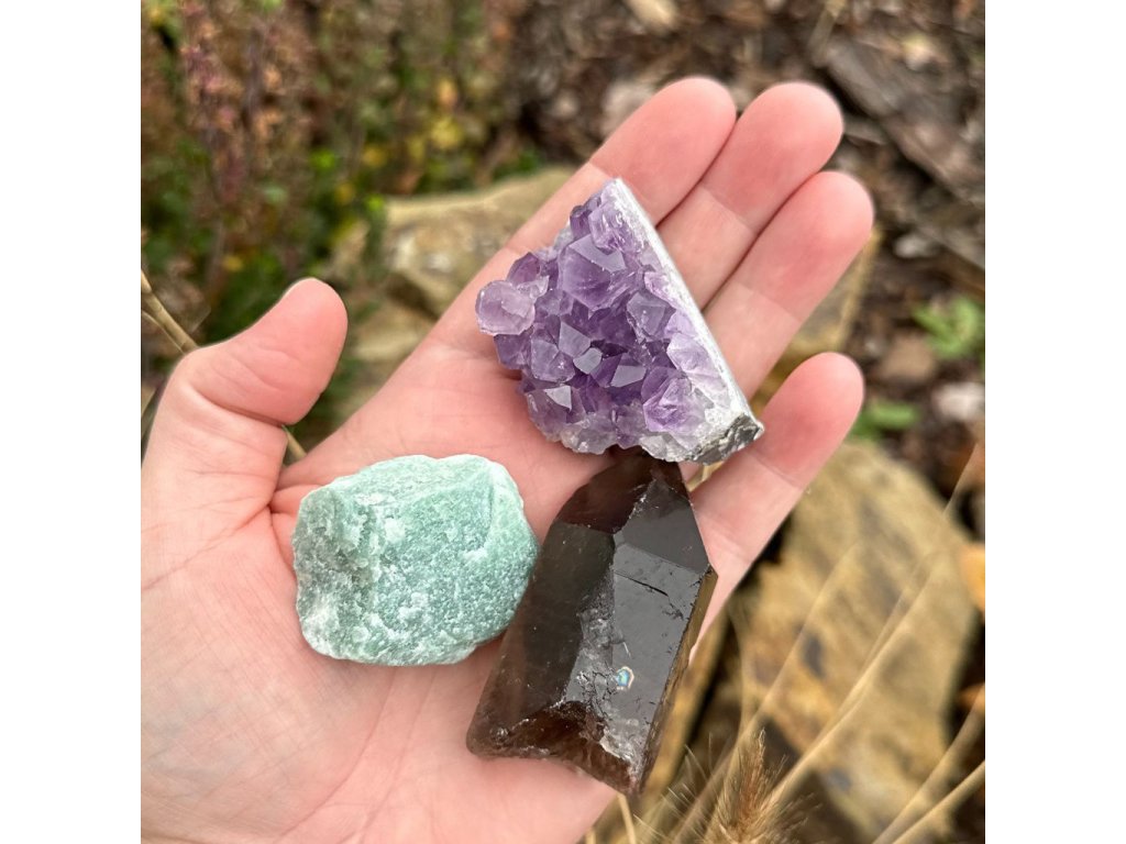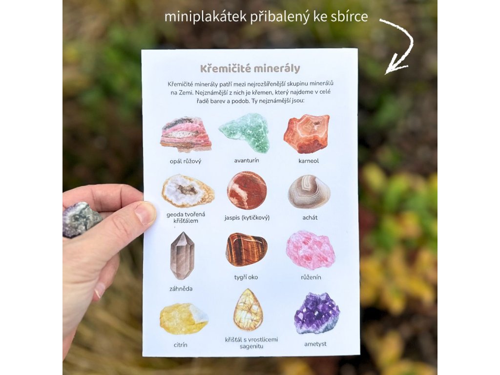 - 9 křemičitých minerálů (ametyst, křišťál, záhněda, opál, karneol, avanturín, jaspis, tygří oko, achát)