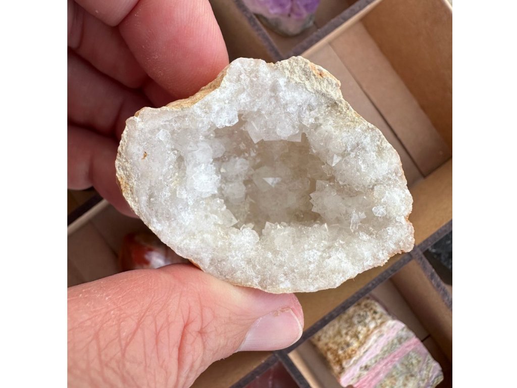 - Křišťál – půlená geoda spojená gumičkou, uvnitř se třpytí drobné i větší krystaly (velikost cca 3–7 cm)