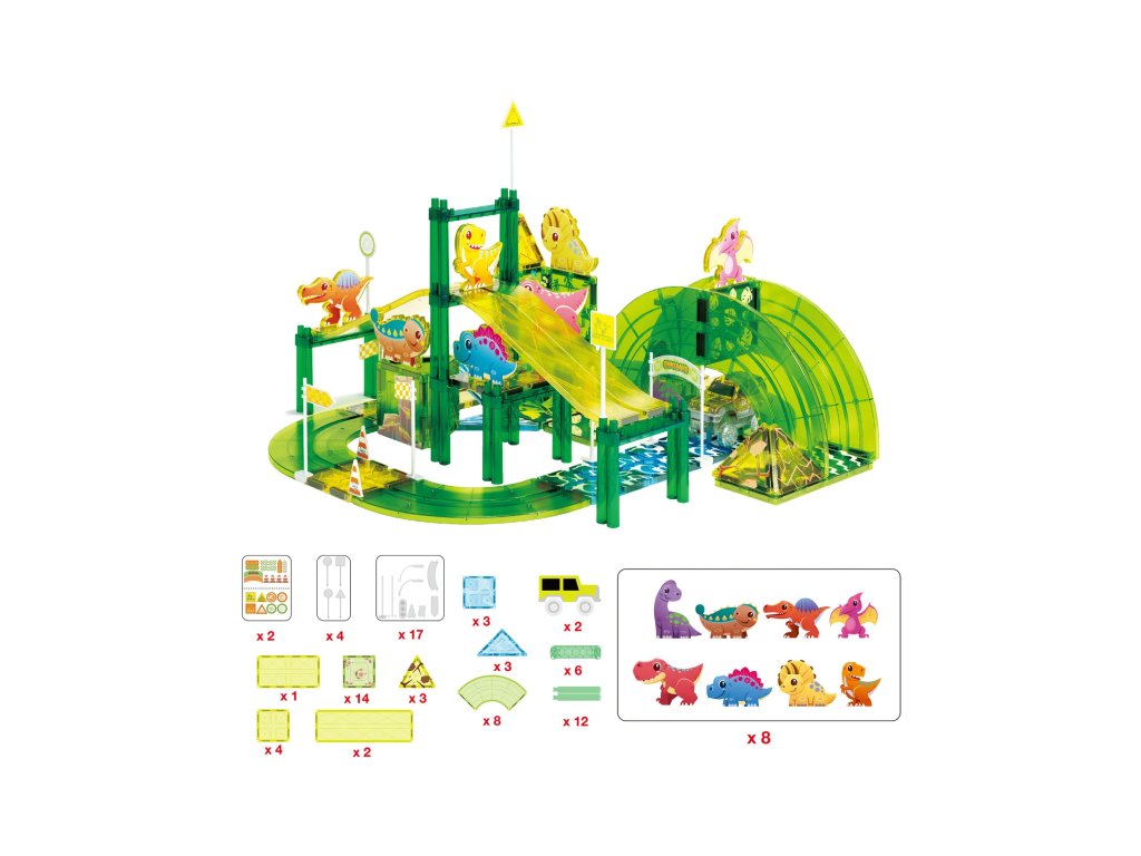 Magnetická dráha ve speciální designu dinosauřího světa. Díly pro dráhu jsou v zeleno-žlutých barvých, což dětem hezky navodí dinosauří svět. Nechybí ani tématické čtverce a trojúhelníky na dokreslení scenerie. A co je nejlepší? Součástí balení jsou i figurky dinosaurů, a to rovnou 8. Děti tak získají nejen T-Rexe či Stegosaura, ale také Raptora, Triceratopse a další figurky. V jednom balení tak získáte hned několik zábavných prvků.