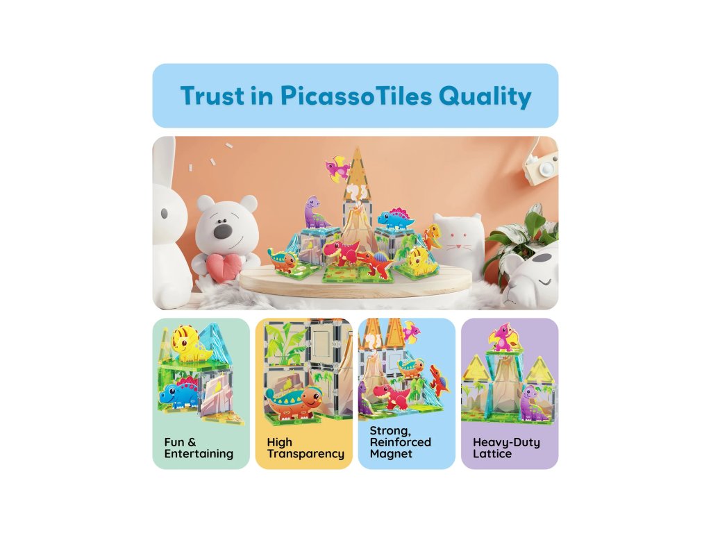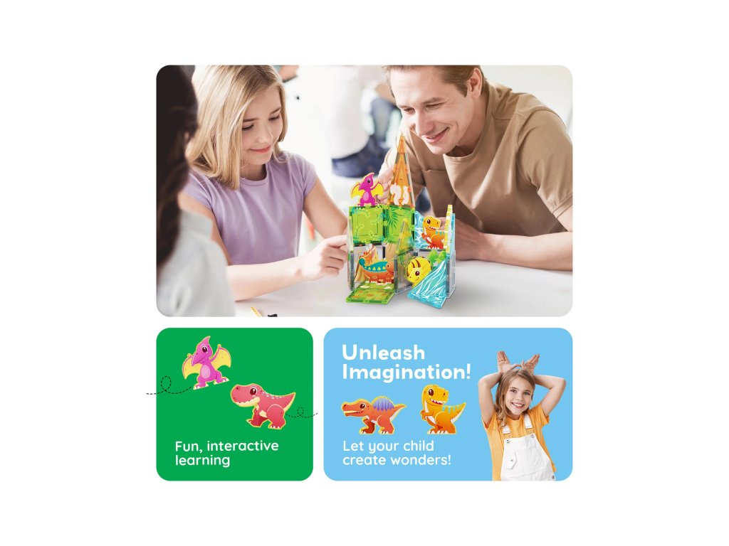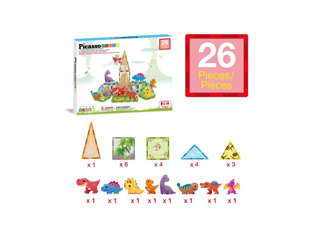 Magnetická stavebnice PicassoTiles - Dino world vás zavede do prehistorického světa. Můžete si postavit vlastní dinosauří zákoutí se speciálně vzorovanými magnetickými díly nebo si jen tak pohrát s magnetickými figurkami zvířátek, která jsou součástí balení. Sada podněcuje dětskou kreativitu a myšlení. Kromě hraní můžete vymýšlet vlastní příběhy nebo sehrát krátké divadélko.