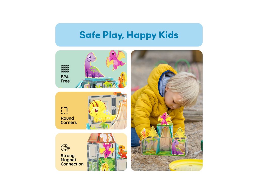 - kompatibilní s dalšími magnetickými stavebnicemi, např. Connetix,Coblo, Magna Tiles, MiDeer, Learn & Grow, Magbrix Cleverclixx MNTL