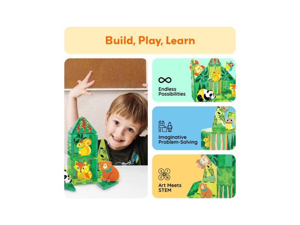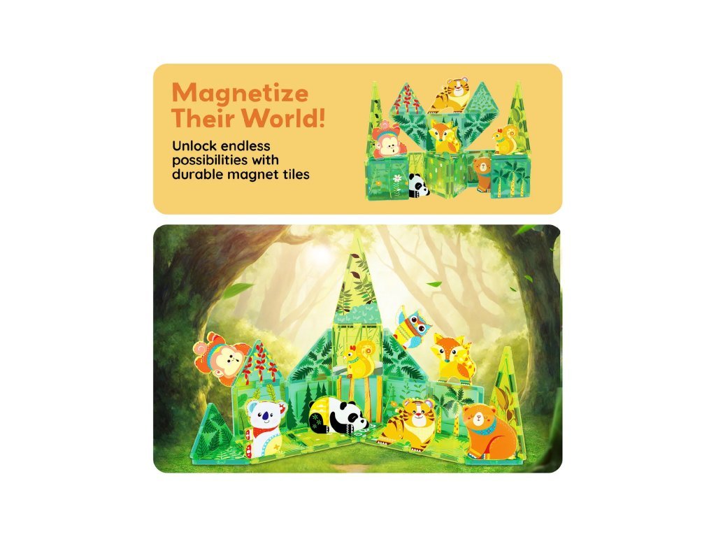 Magnetická stavebnice Picasso Tiles - Forest animal vás zavede do lesní světa. Můžete si postavit vlastní les se speciálně vzorovanými magnetickými díly nebo si jen tak pohrát s magnetickými figurkami zvířátek, která jsou součástí balení. Sada podněcuje dětskou kreativitu a myšlení. Kromě hraní můžete vymýšlet vlastní příběhy nebo sehrát krátké divadélko.