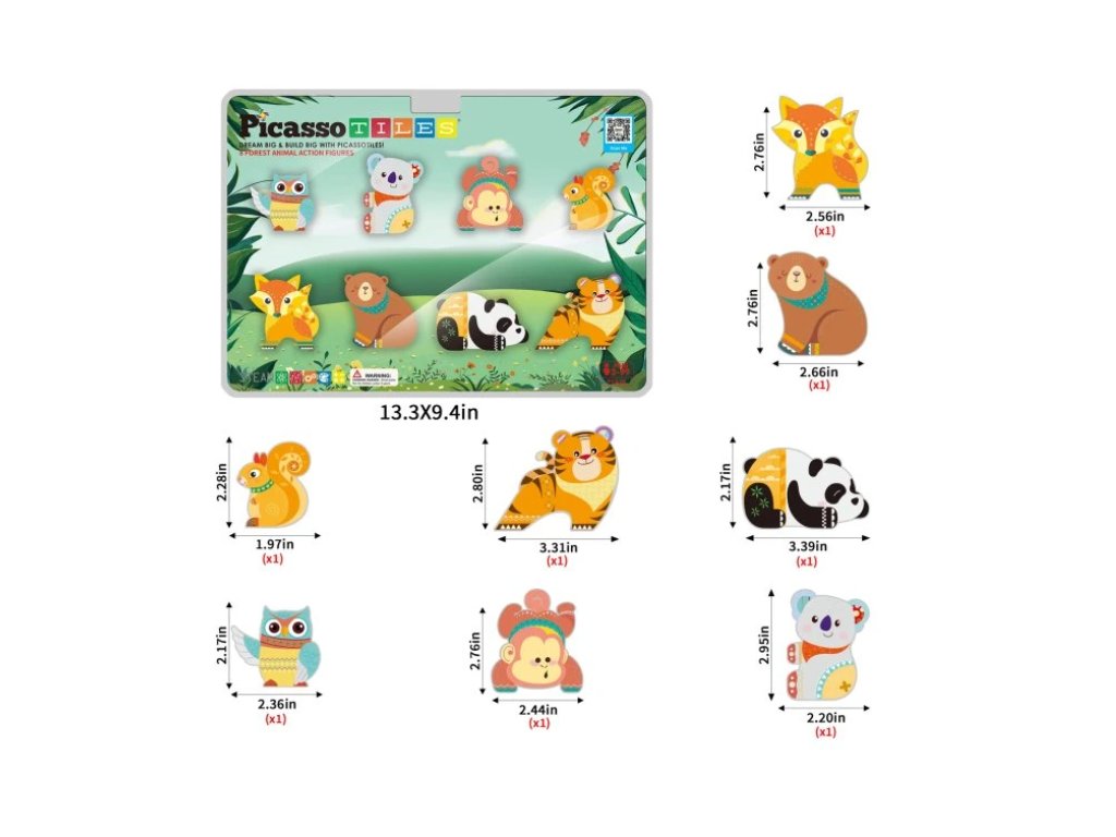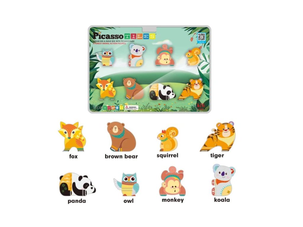 Magnetická figurky PicassoTiles v motivu zvířátek z lesa. Postavičky v sobě mají zabudovaný magnet, a tak přilnou na klasické díly magnetické stavebnice. Snadno tak můžete proměnit vaše stavby v malé safari doupě.