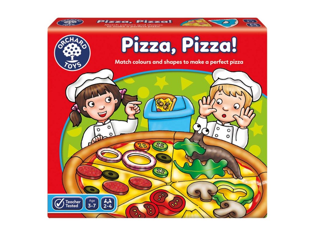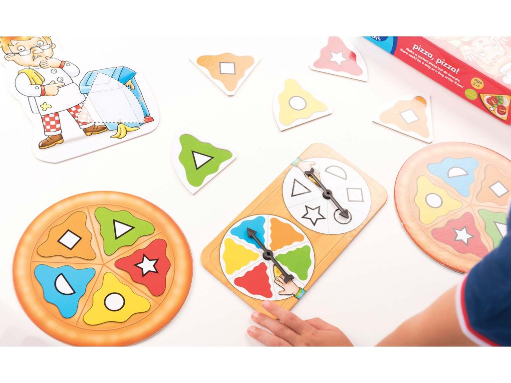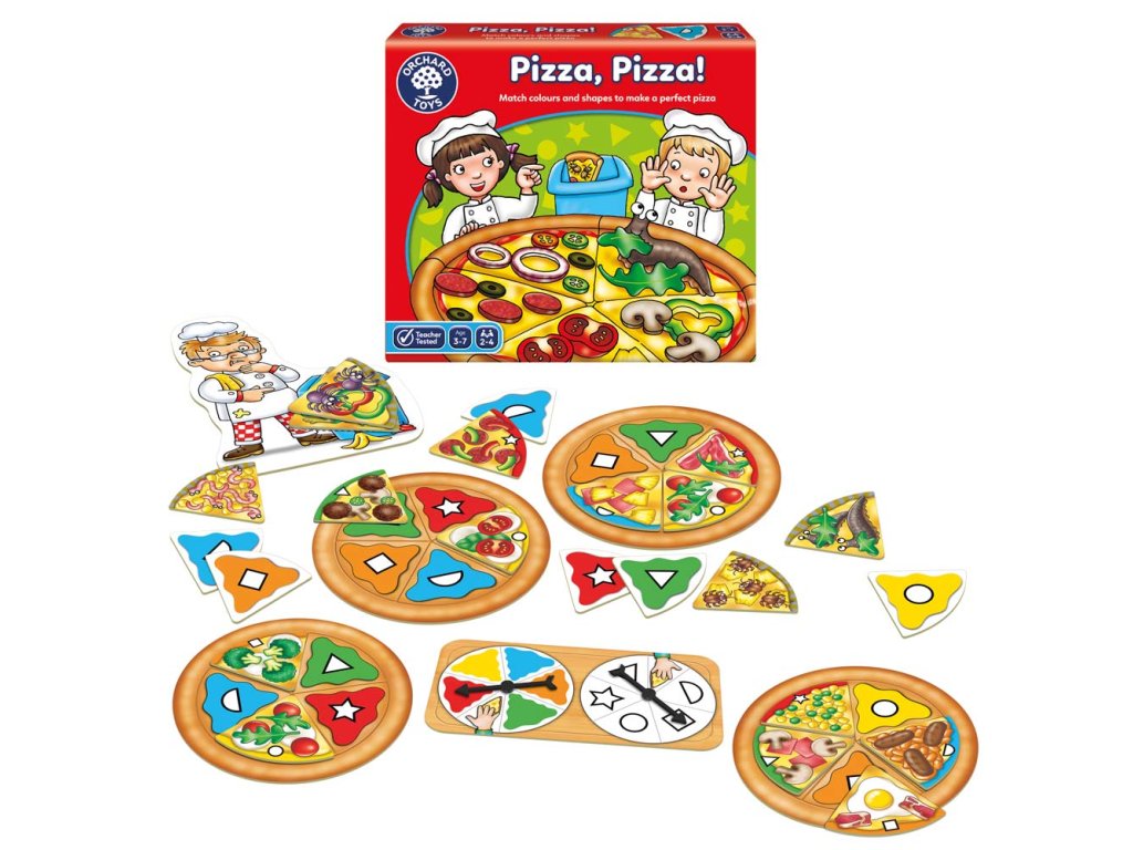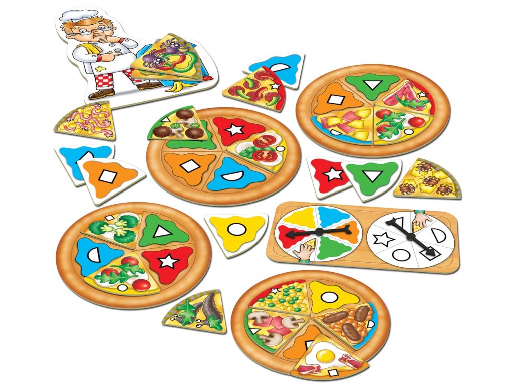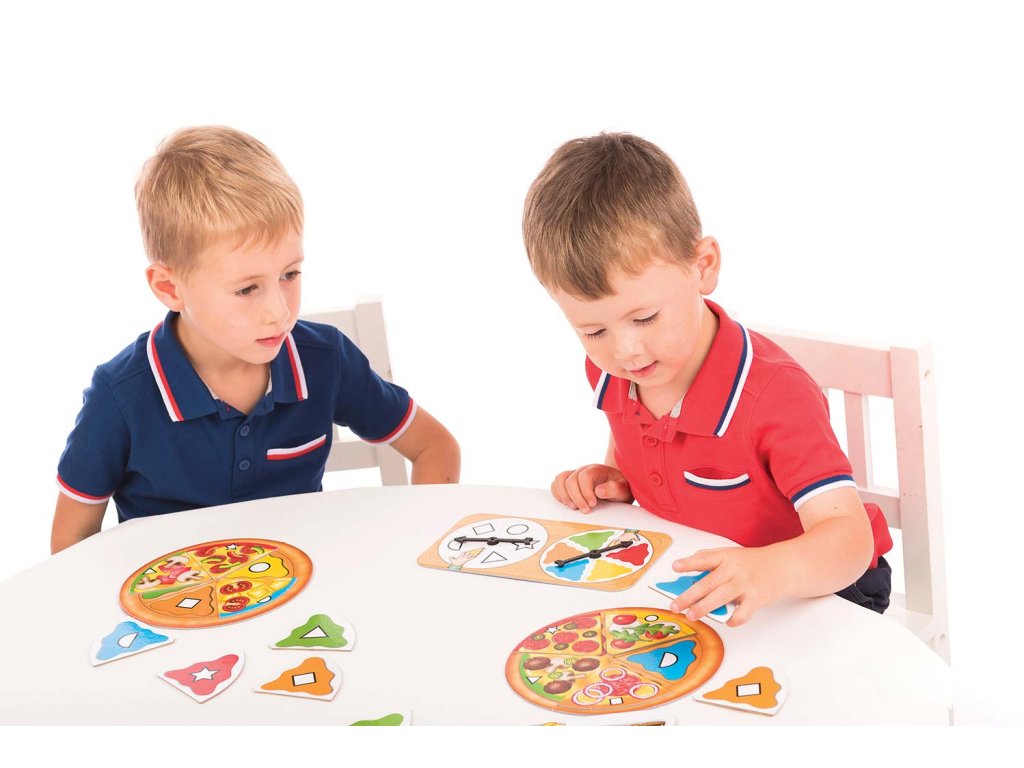 Kdo jako první sestaví pizzu? Netradiční hra na poznávání barev a tvarů, která zabaví celou rodinu. Roztočte dvojitý spinner a vyberte si kartu podle tvaru a barvy. Kdo jako první naplní svůj talíř pizzou, vyhrává. Jen pozor na náplně - některé musí jít ihned do koše! Na rozdíl od klasické pizzy jsou náplně v této hře někdy velmi neobvyklé, což děti baví a přidává hře na zábavě. Kartičky s náplněmi můžete navíc použít k tomu, abyste si s dětmi popovídali o různých jídlech nebo o tom, jaká pizza by byla dokonalá podle nich.