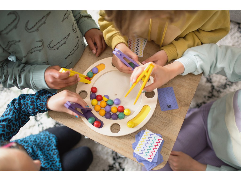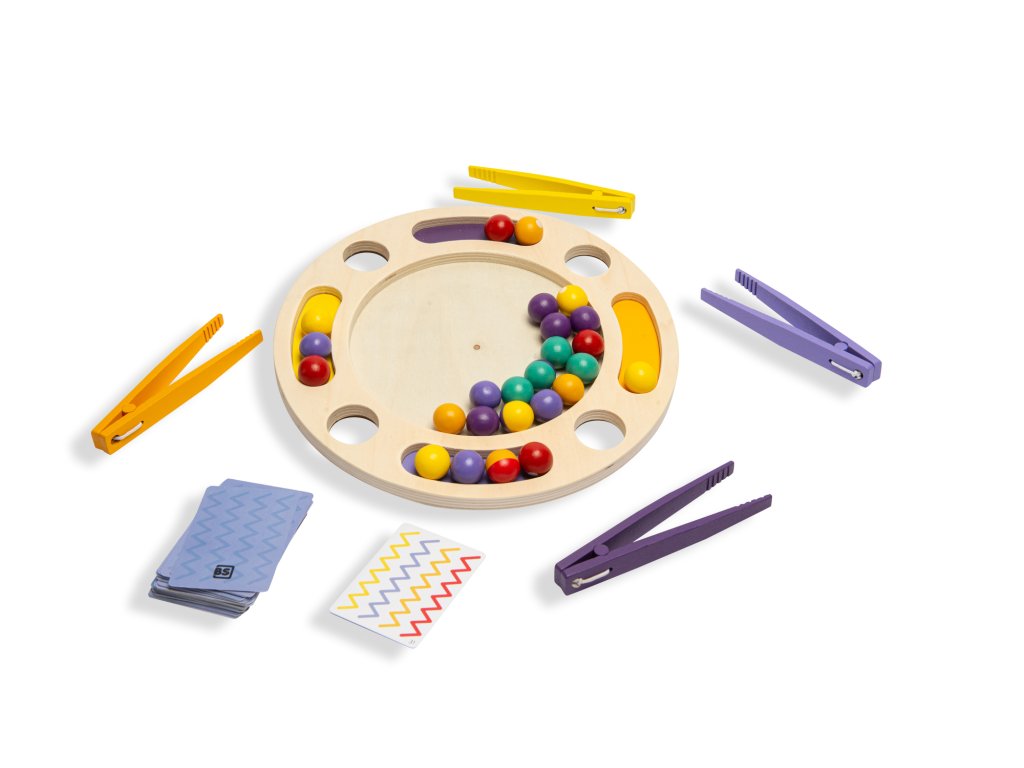 - úlohou je pomocou pinzety zbierať farebné guľôčky podľa farieb na kartičke