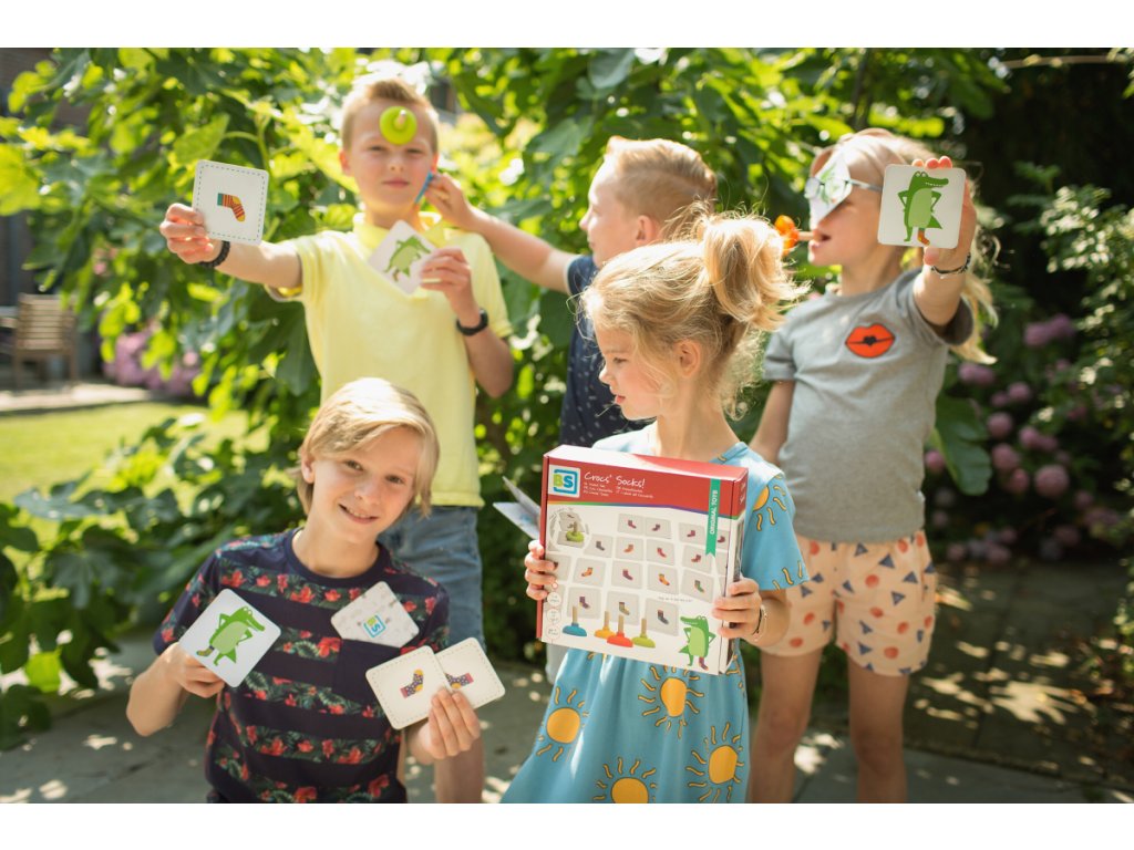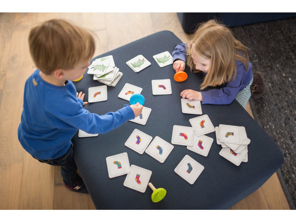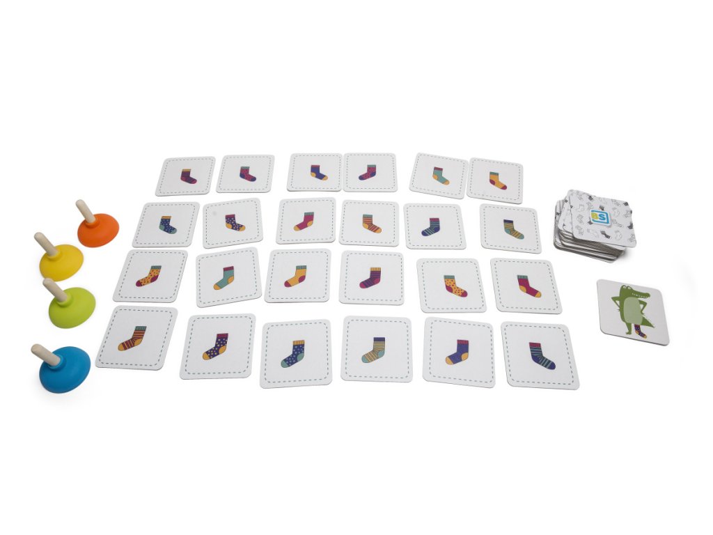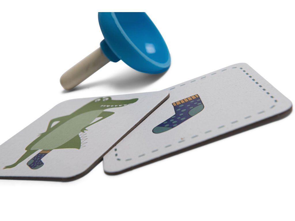 Krokodíl je trochu zmätený! Potrebuje nájsť svoje ponožky, ale nemôže nájsť vhodný pár. Môžete mu pomôcť? Otoč kartu a buď prvý, kto chytí chýbajúcu ponožku pomocou prísavky. Len si daj pozor, aby si správne rozlíšil, či hľadá pravú alebo ľavú ponožku. Ak sa pomýlite, pravú ponožku môže medzitým chytiť druhý hráč.