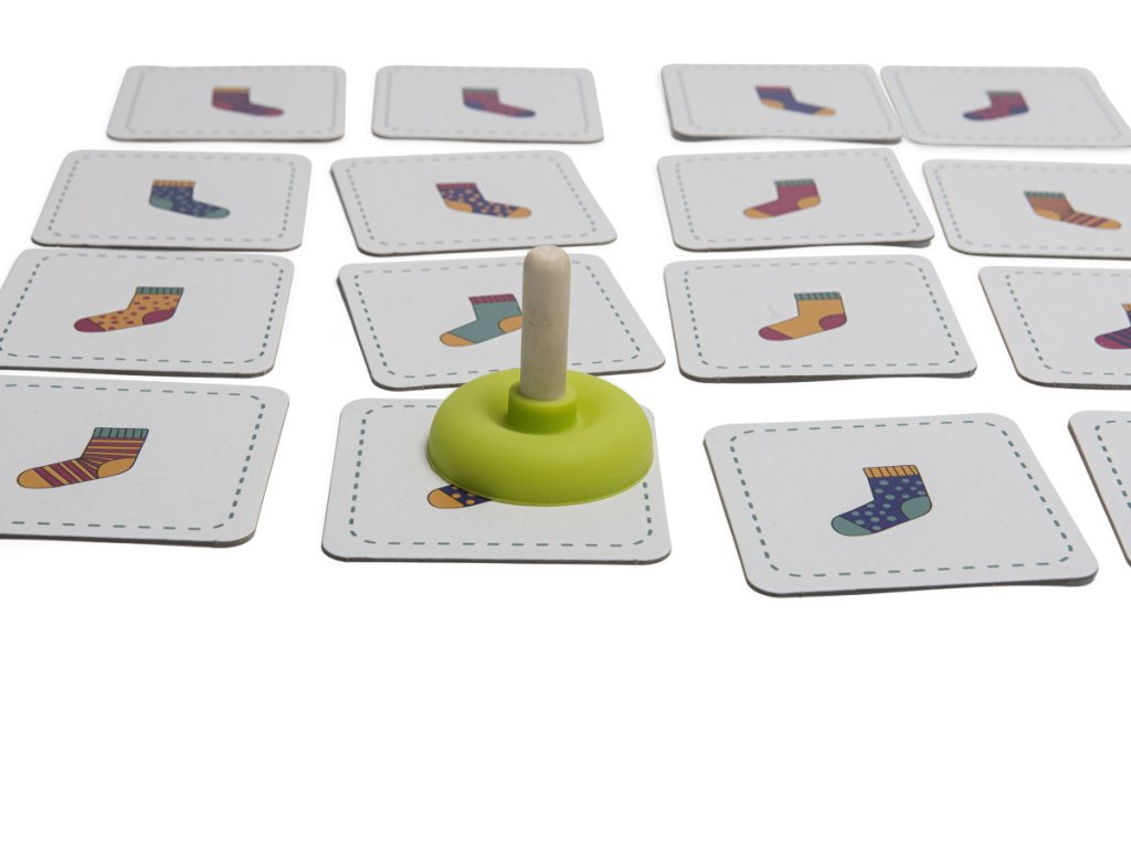 - cieľom je nájsť ponožku v páre a pomocou prísavky chytiť kartičku s jej obrázkom .