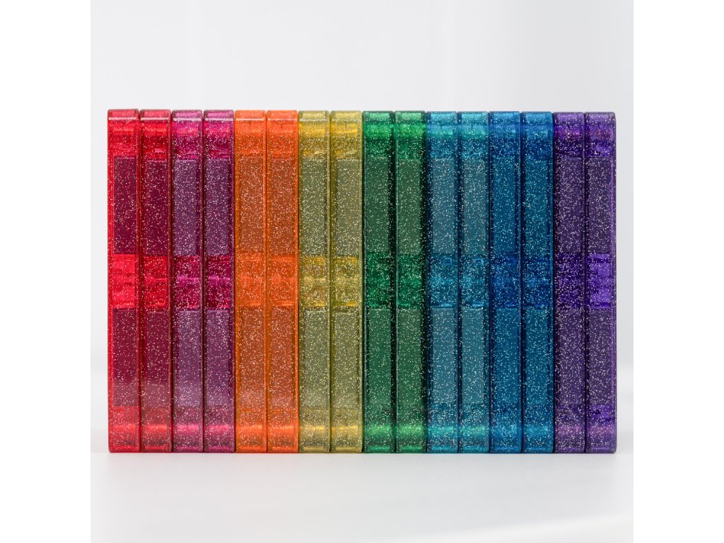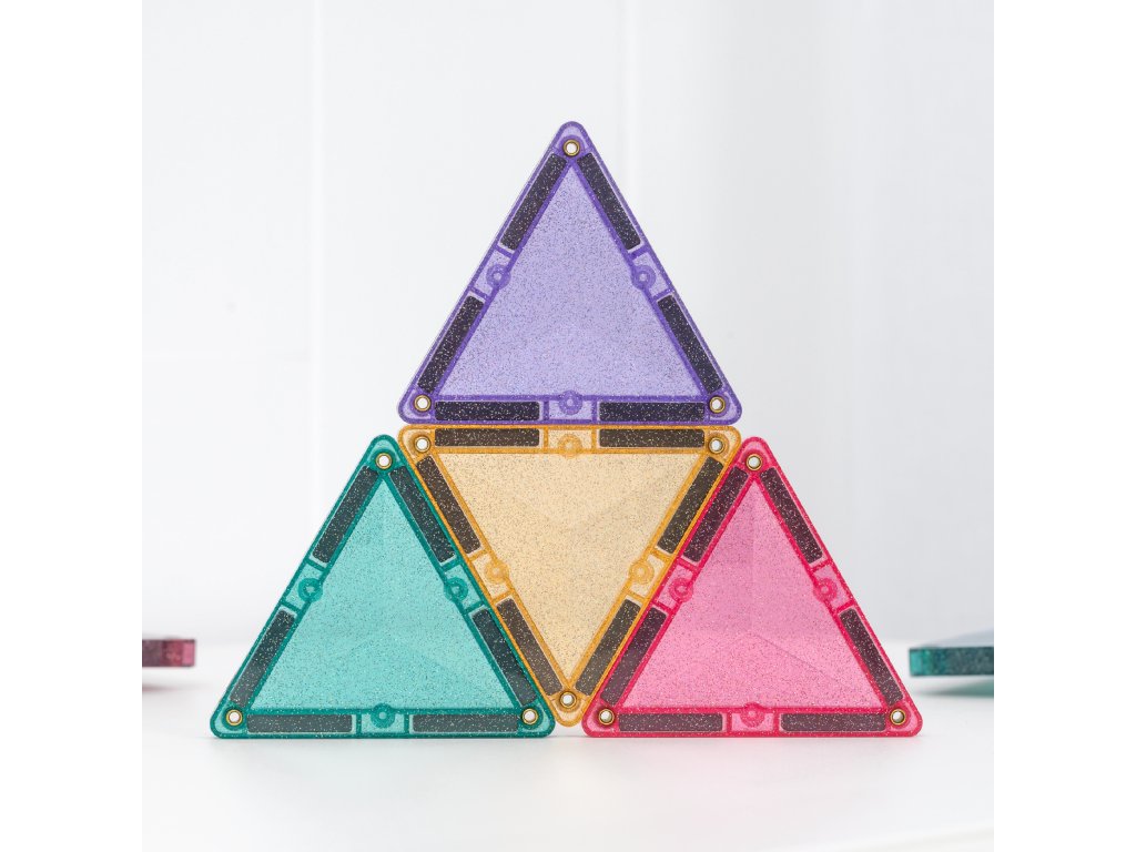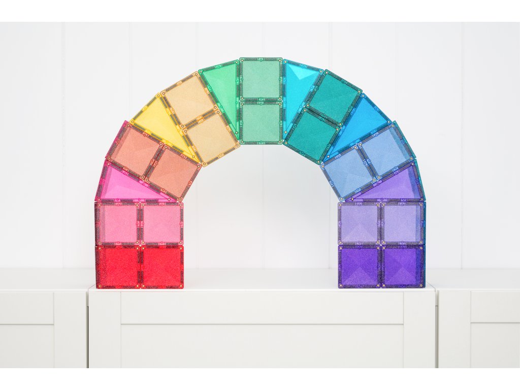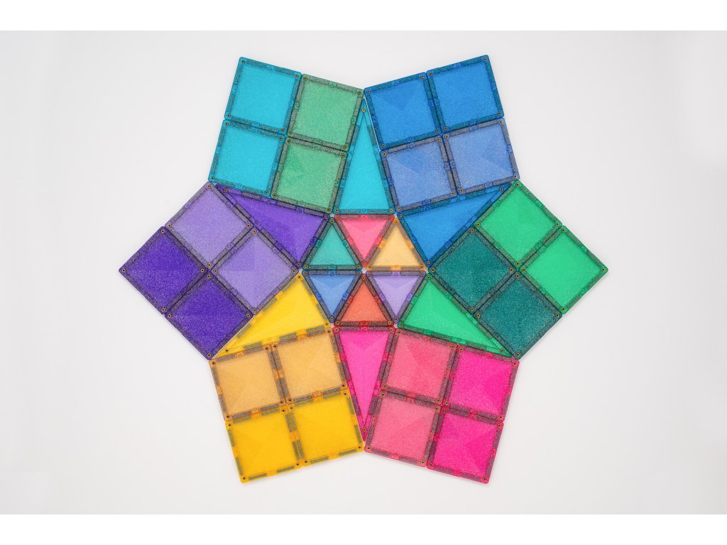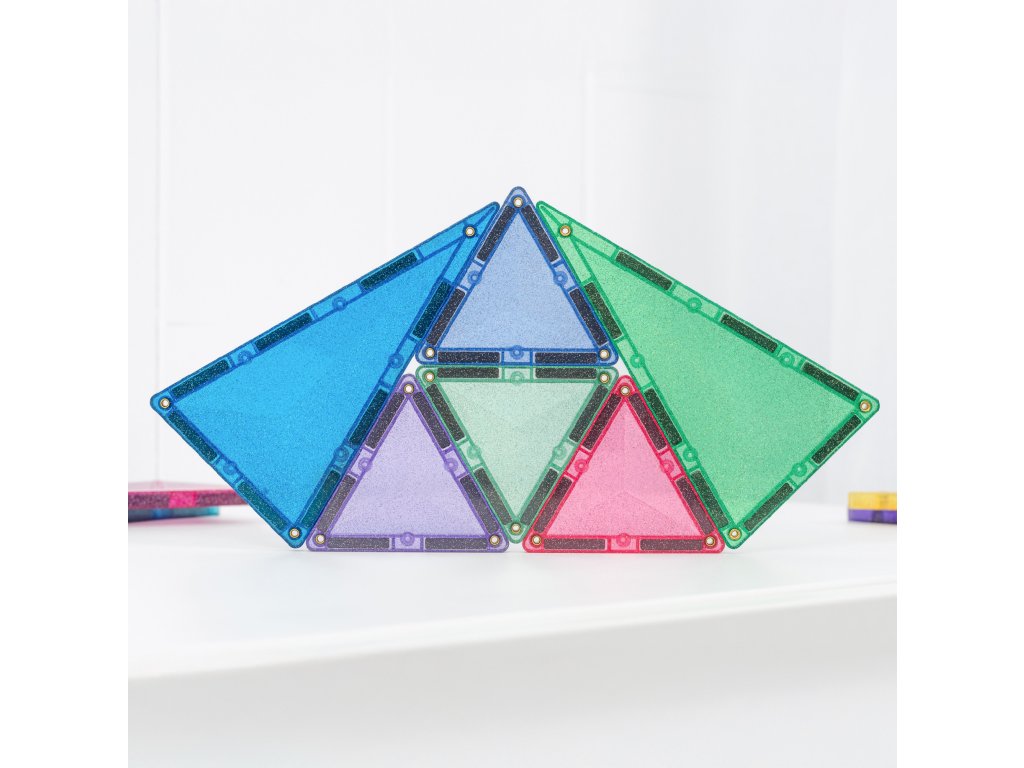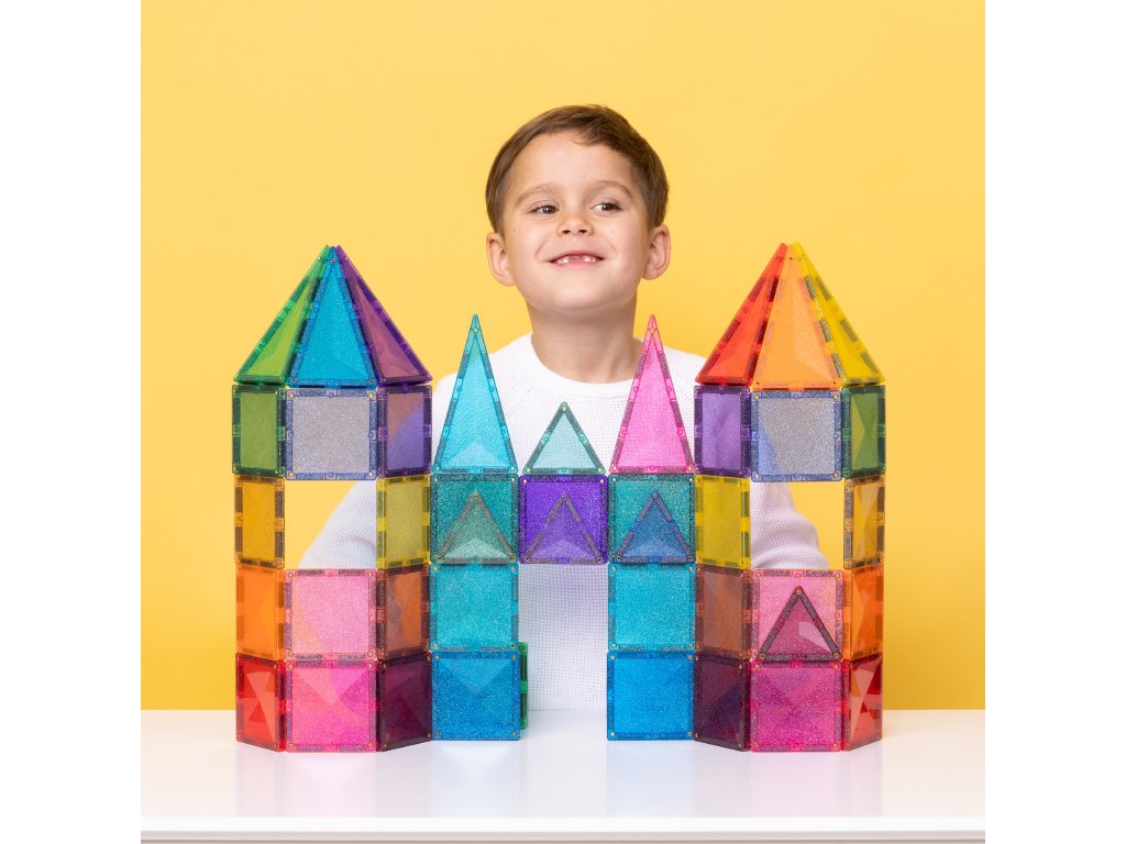 Magnetická stavebnica Connetix Tiles Glitter Castle s dielikmi so špeciálnou trblietavou úpravou. Vytvorte ešte viac farebných a lesklých stavieb. V balení nájdete štvorce a trojuholníky, ktoré sú v celkovo 16 farbách Môžete si vytvoriť vlastný hrad, trblietavé kvety a čokoľvek iné, čo vás napadne. Všetko v nezvyčajných farbách, ktoré zaujmú na prvý pohľad.