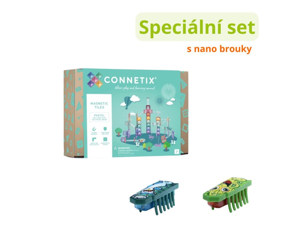 Zvýhodnená sada Connetix Tiles Magnetic Ball Tracker (106 ks) v pastelovej farbe a 2 ks Hexbots Nano Single