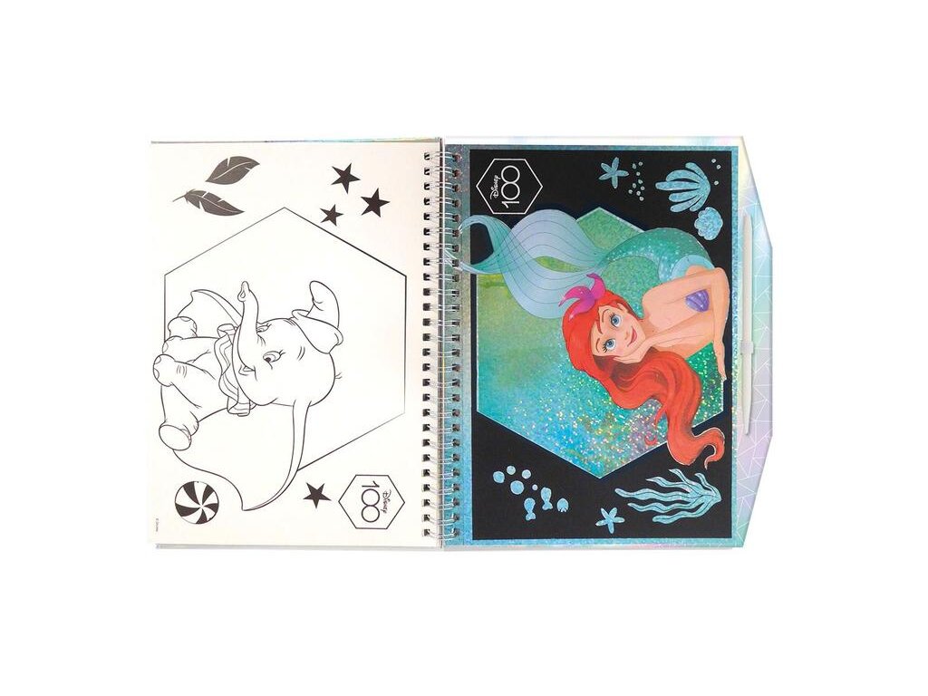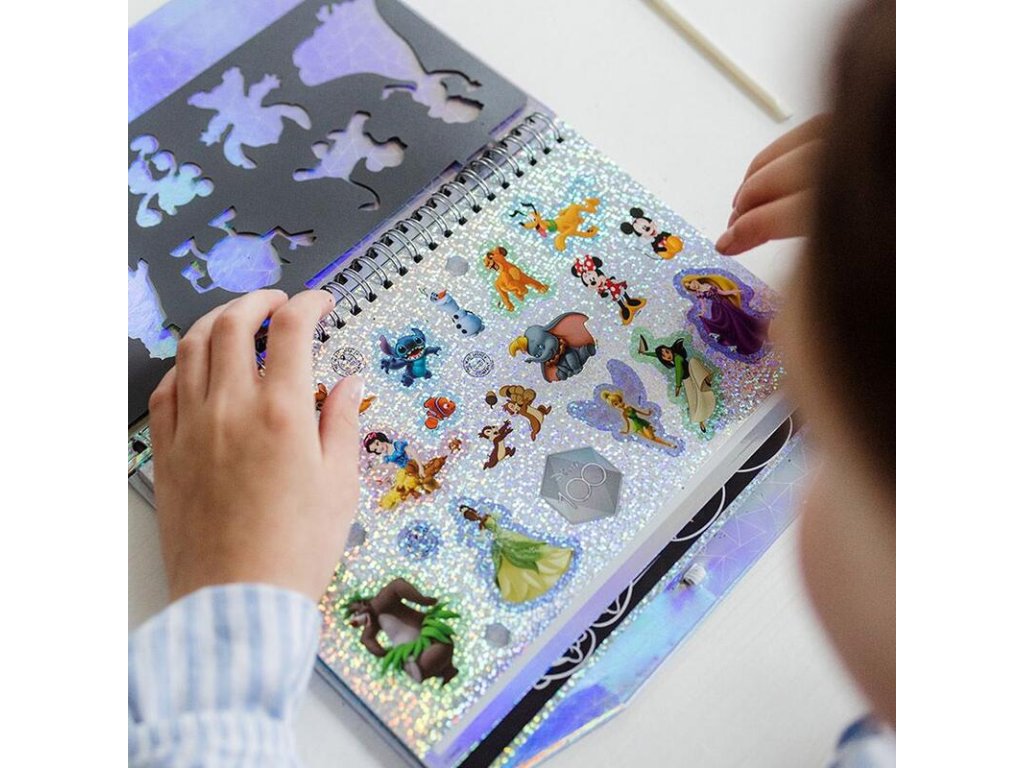 Kreatívna súprava s motívom obľúbených postavičiek Disney. Nájdete v nej 10 stieracích stránok, na ktorých deti odhaľujú obrázok pomocou stieracej ceruzky, ktorá je súčasťou balenia. Okrem toho súprava obsahuje farebnú scénu, ktorú si deti môžu domalovať. A tiež samolepku aech a šablónu na vymaľovanie. Táto kreatívna súprava je vhodná na cesty, pretože nezaberie toľko miesta. Môžete ju však používať aj doma. Vhodná pre deti od 3 rokov.