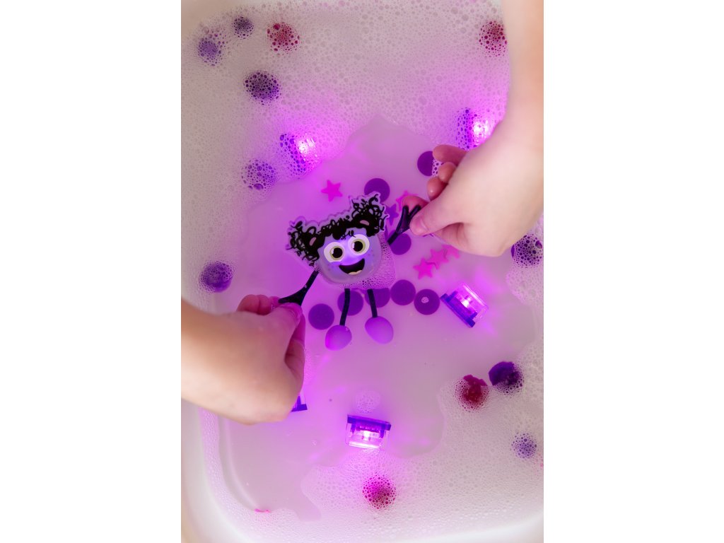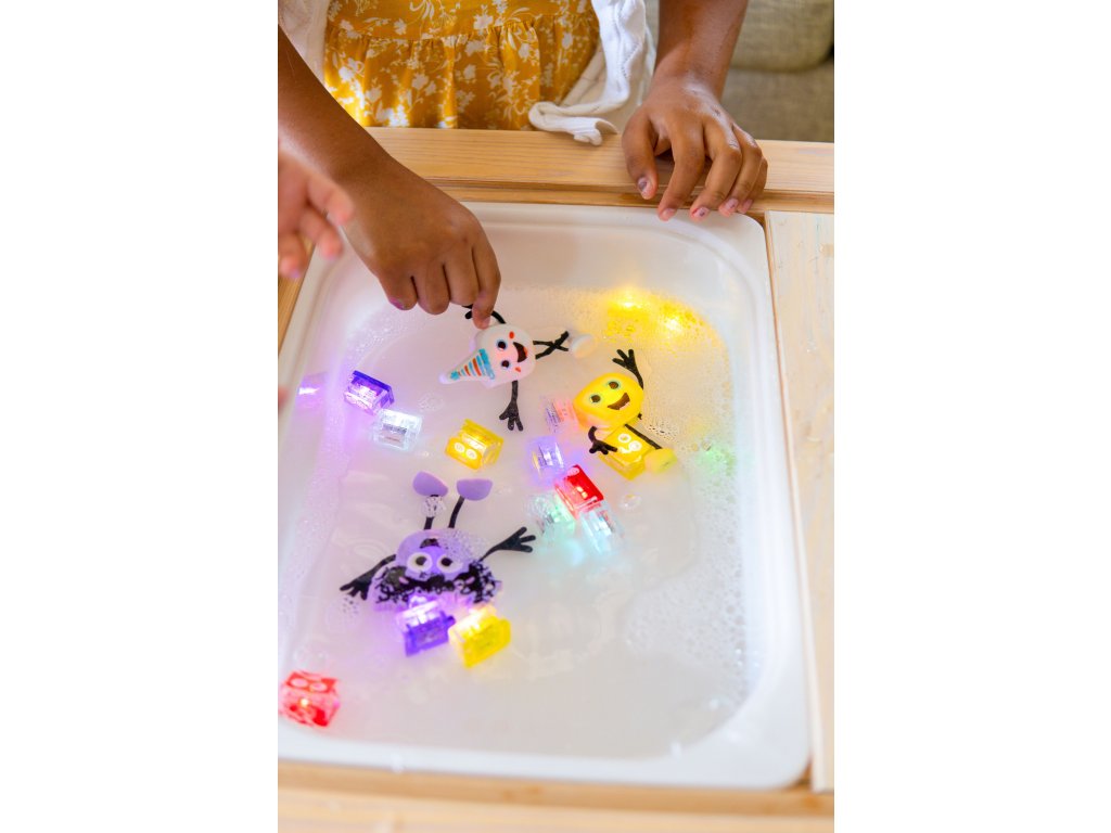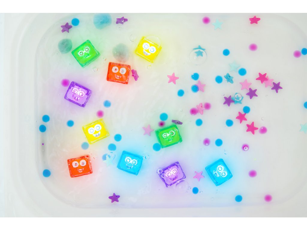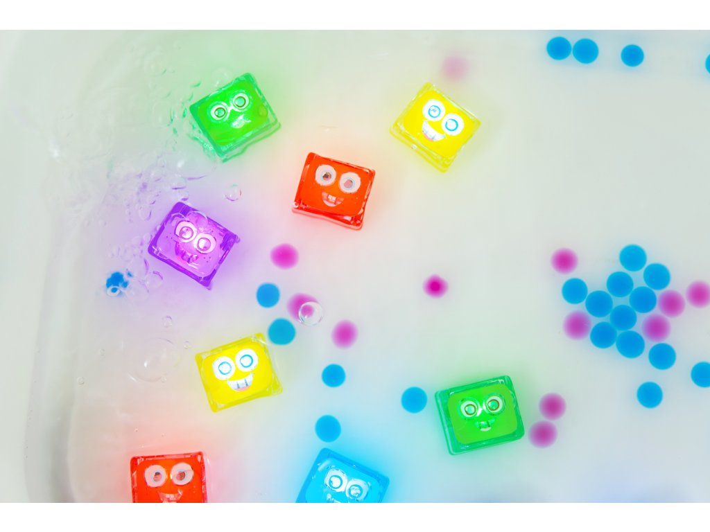 - Hračka do kúpeľa - vylovte farebné kocky z vody, nájdite ich pod penou alebo si užite svetelnú zábavu, ak rodičia znížia intenzitu svetla.