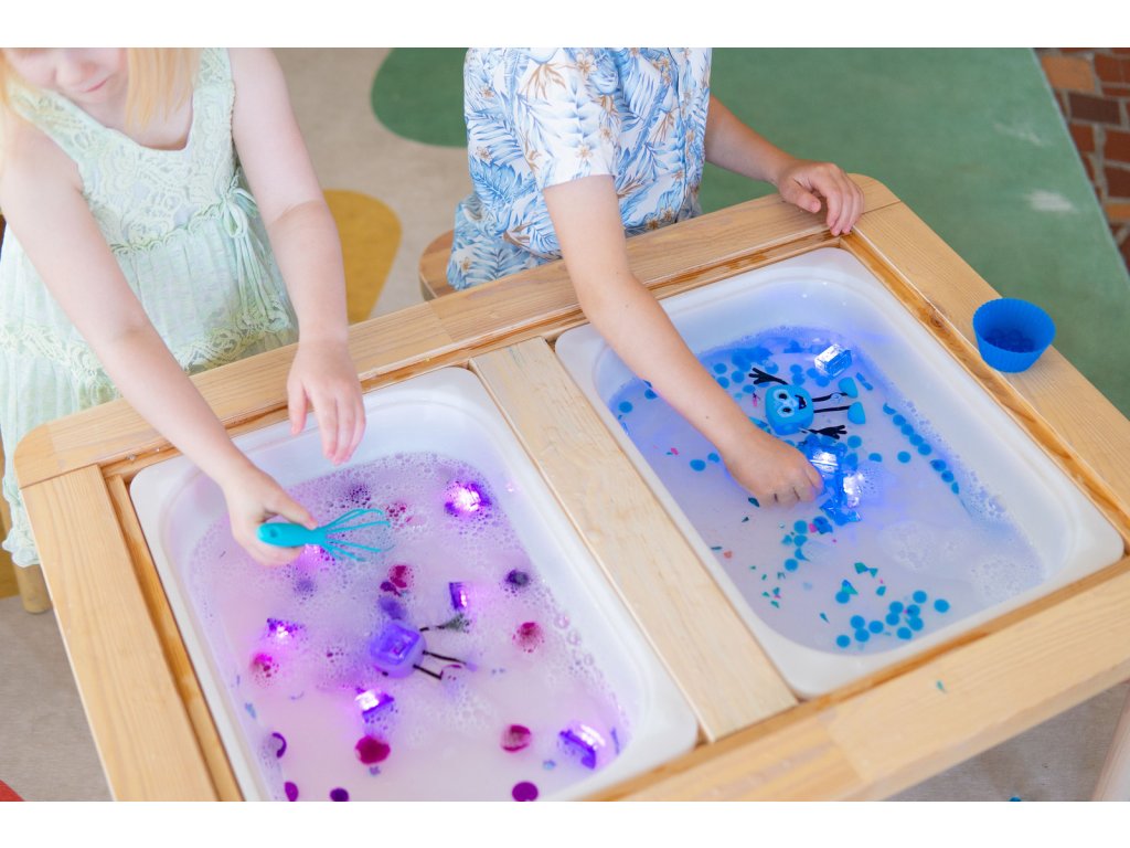 - Tvorivá senzorická hračka - kocky sa aktivujú pri kontakte s vodou, takže sa dajú použiť na hry, ktoré rozvíjajú motoriku, zmyslové schopnosti a kreativitu. Dieťa môže loviť kocky pomocou tyčiniek, kliešťov a môže si vytvoriť fľaše pre vlastnú potrebu plné guličiek, trblietok, flitrov a iných prvkov.