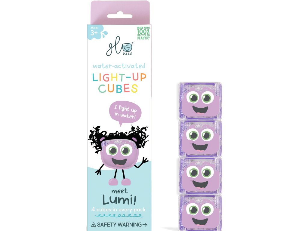 Ponorte sa do farebnej zábavy s kamarátmi Glo Pals. Unikátne senzorické kocky po vhodení do vody svietia. Sú preto skvelé do vane alebo bazéna, kde deťom spríjemnia čas a poskytnú nový rozmer zábavy. Môžete ich použiť aj na zmyslovú hru. Stačí ich vložiť do pohára alebo inej nádoby a neobyčajné divadlo sa môže začať. Je ľahké vyrobiť si vlastné senzorické fľaše a lampy, ktoré zabavia menšie deti. Ku kockám môžete dokúpiť aj špeciálnu figúrku Lumi v rovnakej fialovej farbe, do ktorej môžete vložiť kocky a získať tak svietiacu postavičku. Môžete si však vybrať aj ďalšie farby postavičiek alebo kociek.