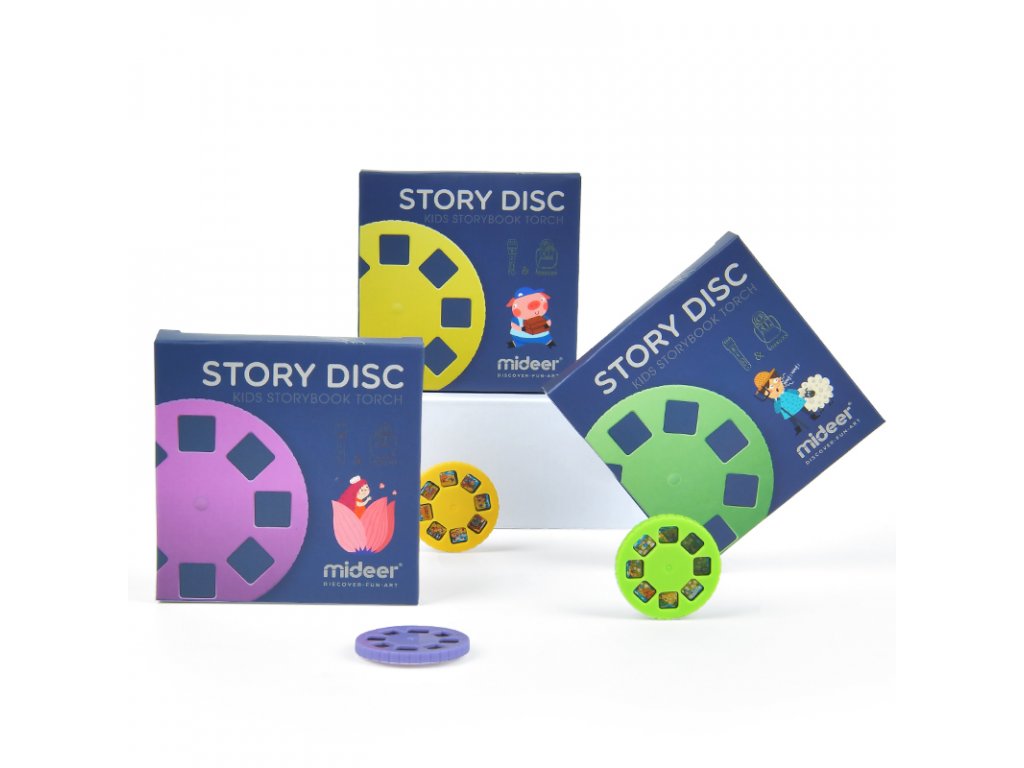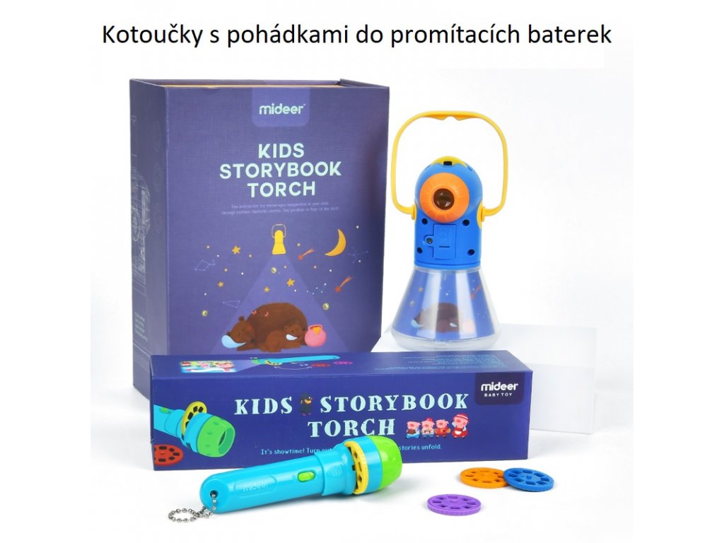 Vypněte světlo v pokoji, vložte do baterky kolečko a povídání může začít. Balení obsahuje 4 pohádky, které můžete snadno zastrčit do promítací baterky. Každá pohádka má celkem 8 snímků.