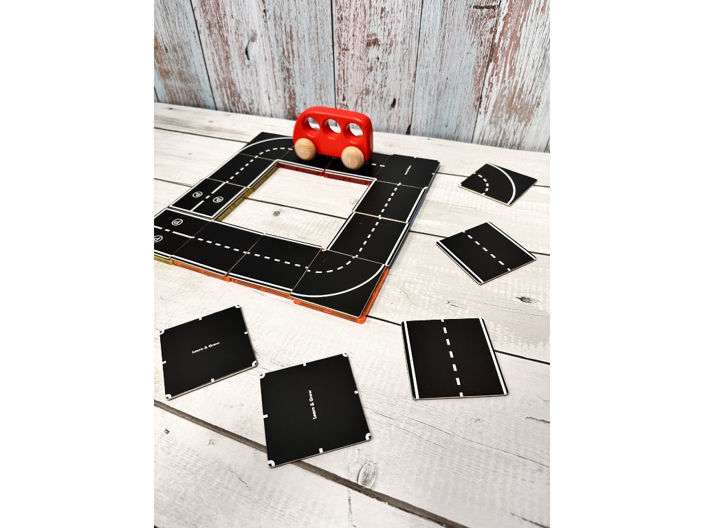 Špeciálne navrhnuté magnetické dlaždice, ktoré dokonale dopĺňajú magnetické stavebnice rôznych značiek. Vďaka cestnému dizajnu môžete z magnetickej stavebnice ľahko vytvoriť mesto, autodráhu alebo cestný okruh. Balenie magnetických dlaždíc - cesta od austrálskej značky Learn & Grow Toys je navrhnuté tak, aby sa ľahko prilepilo na magnetické štvorce. Stačí ich jednoducho priložiť a dlaždice sa vďaka magnetu prilepia, takže po nich môžu spokojne jazdiť autá. Sú vyrobené z pevnejšieho materiálu a ľahko sa utierajú.