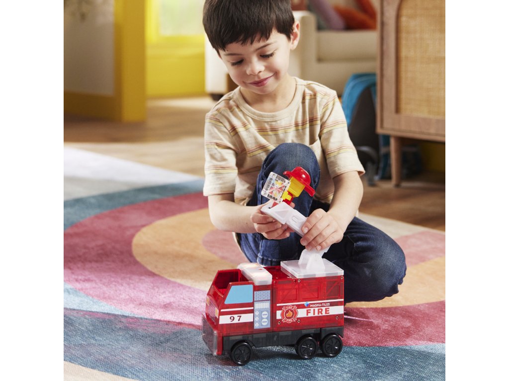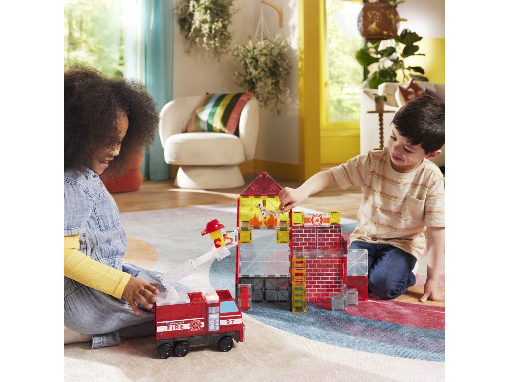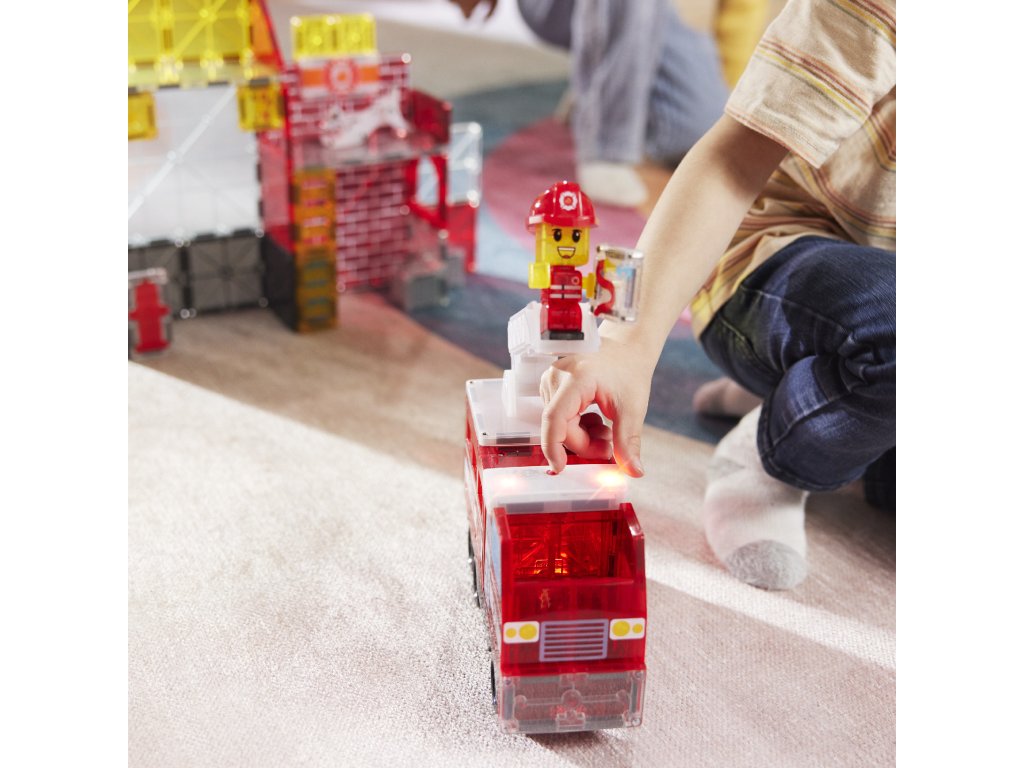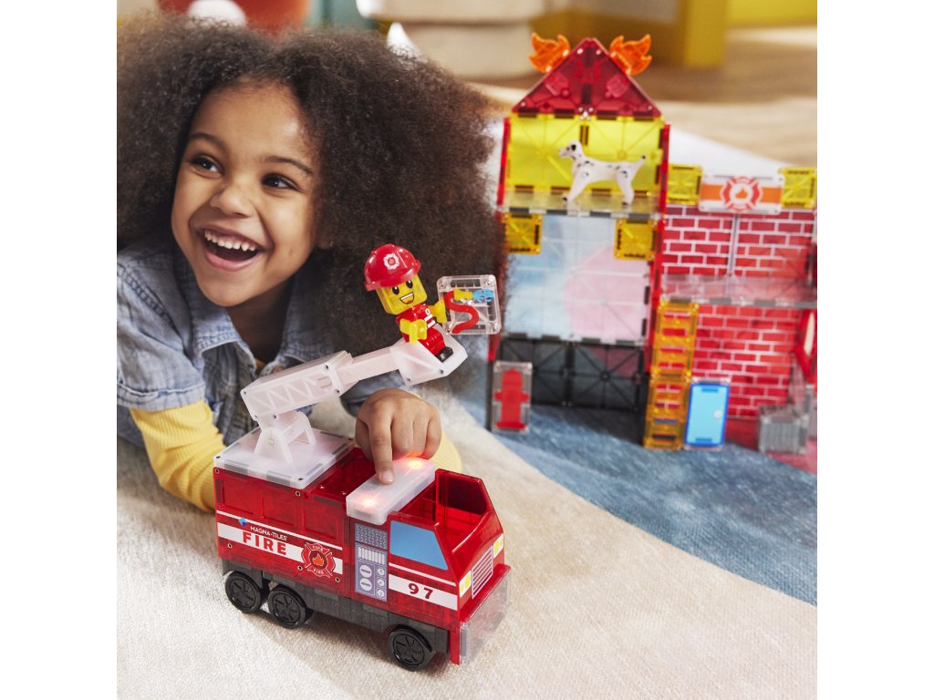 Toto je sen každého malého hasiča. Môžete si vytvoriť vlastnú hasičskú stanicu, ktorej súčasťou je aj siréna. K dispozícii je aj štýlové hasičské auto a figúrka hasiča. Tak si priprav hadice, zapáľ majáky a vzbuď sa do akcie, aby si uhasil požiar! Interaktívna magnetická stavebnica Magna Tiles Hasičská stanica obsahuje neobvyklé vzorované diely, s ktorými si deti užijú veľa zábavy. Svetelné a zvukové dieliky sirény blikajú, hrajú a húkajú, akoby deti boli uprostred skutočnej akcie. Auto má výsuvný rebrík, takže deti môžu zachraňovať bábiky a zvieratká z vyšších budov. Táto skvelá kombinácia magnetických stavebníc a tematickej hry sa bude páčiť nejednému malému hasičovi.