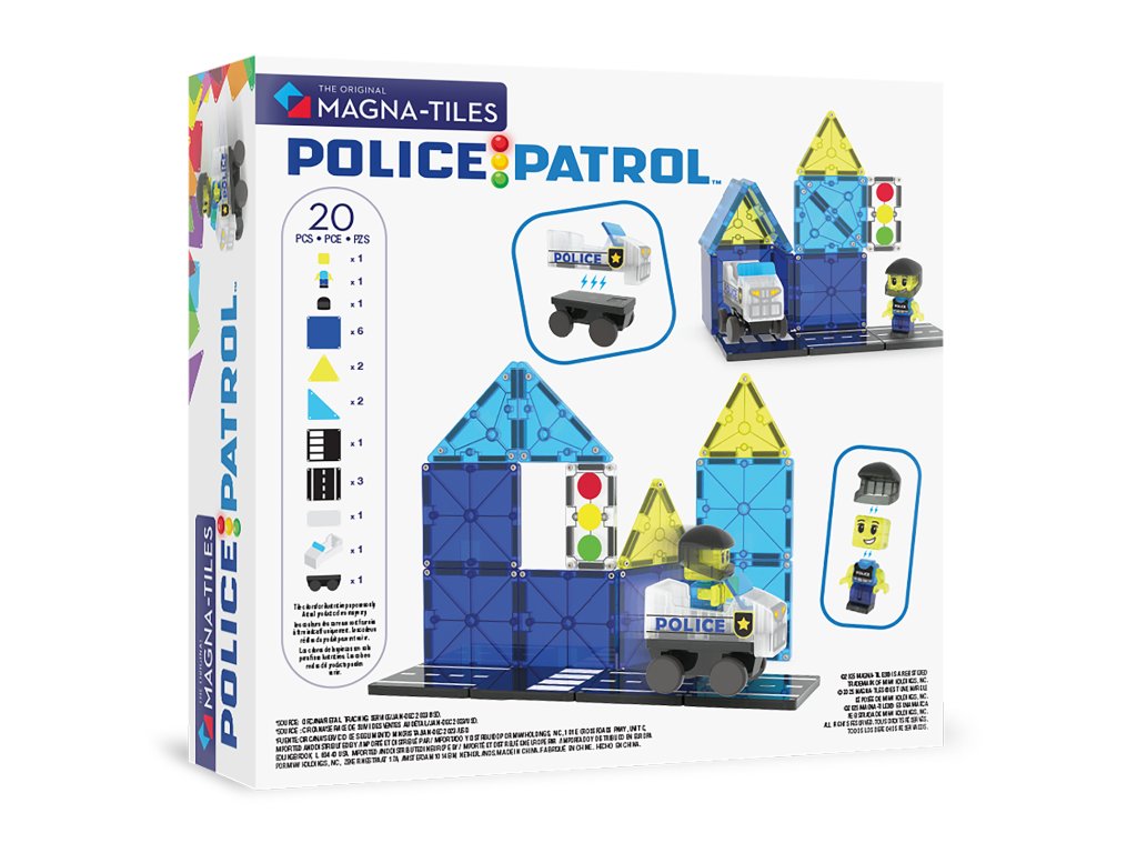 Policajná hliadka vpred! Magnetická stavebnica Magna Tiles Policajná hliadka prináša nový rozmer hry tým, že kombinuje magnetické stavanie s tematickou hrou. Súprava obsahuje dieliky v štýle policajnej hliadky - nechýba figúrka policajta, auto ani semafor! Deti si tak môžu ľahko vytvoriť vlastné policajné hliadky a užiť si novú zábavu. Okrem klasických štvorcov a štvrťkruhov súprava obsahuje aj dieliky microMAGS.
