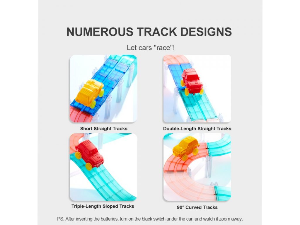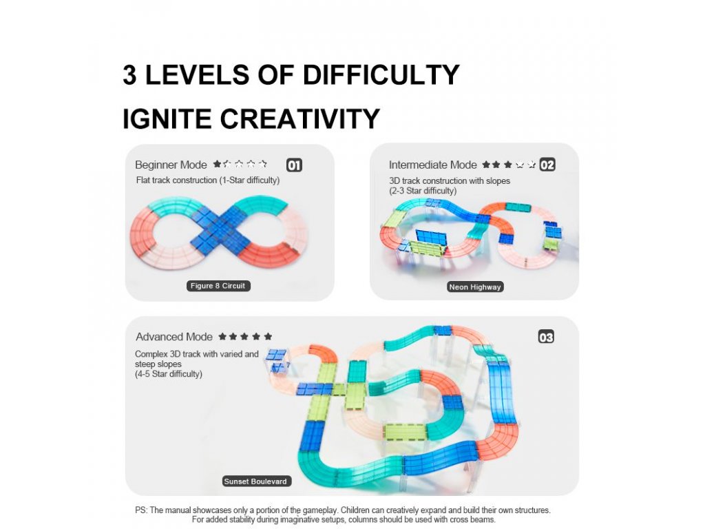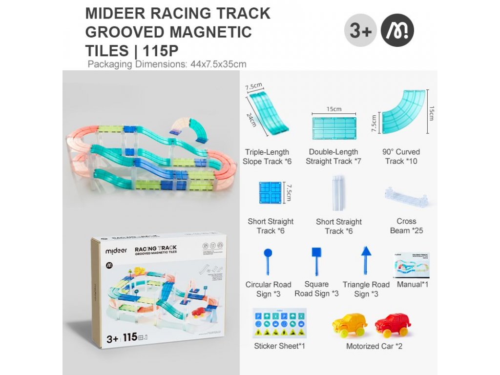 Magnetická stavebnica MiDeer v podobe pretekárskeho okruhu. Vďaka veľkému počtu ciest, zákrut, rámp a stĺpikov si môžete zakaždým postaviť inú trať. Pre inšpiráciu balenie obsahuje aj návody na viac ako 40 rôznych stavieb, ktoré môžete vytvoriť pomocou magnetickej dráhy. Okruhy sú zoradené podľa náročnosti, takže si na svoje prídu menšie aj väčšie deti.