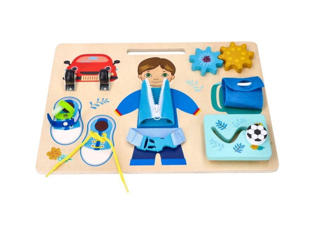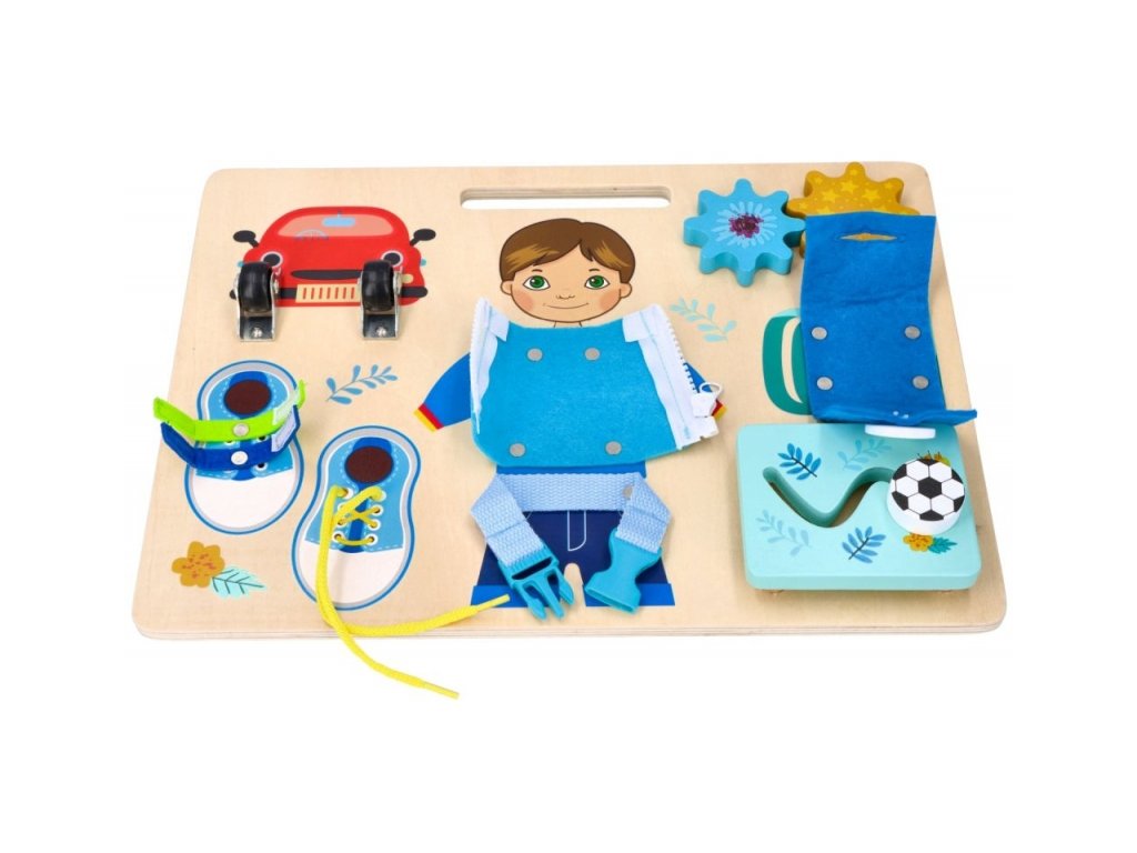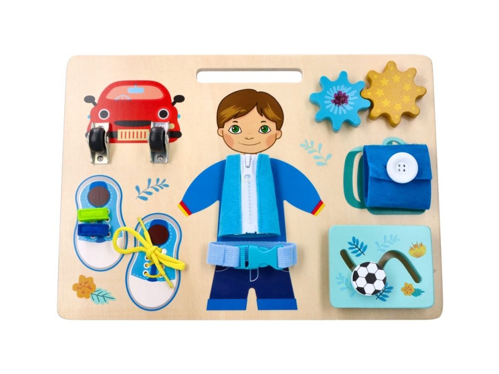 Závesná vzdelávacia tabuľa na rozvoj jemnej motoriky. Vyrobená na základe princípov Montessori. Tabuľa umožňuje trénovať ruku vďaka otváraniu a zatváraniu zámkov a uzáverov. A to rozhodne nie je všetko. Drevená tabuľa obsahuje pohyblivé kolieska, suchý zips, šnúrky, ozubené kolieska, zips, pánt, gombík a posuvný balónik. Všetko v modrej farbe s obrázkom Adama.