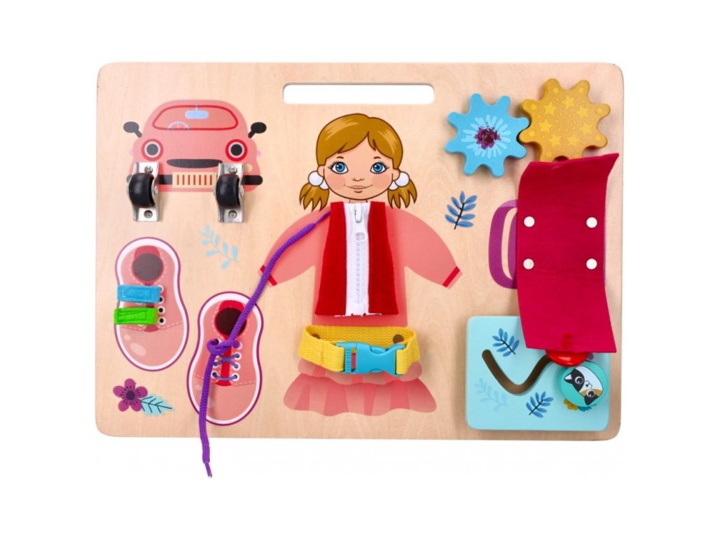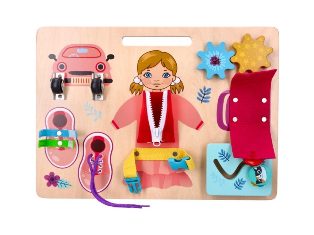 Závesná vzdelávacia tabuľa na rozvoj jemnej motoriky. Vyrobená na základe princípov Montessori. Tabuľa umožňuje trénovať ruku vďaka otváraniu a zatváraniu zámkov a uzáverov. A to rozhodne nie je všetko. Drevená tabuľa obsahuje pohyblivé kolieska, suchý zips, šnúrky, ozubené kolieska, zips, pánt, gombík a posuvnú mačku. Všetko v ružovej farbe s obrázkom Annie.