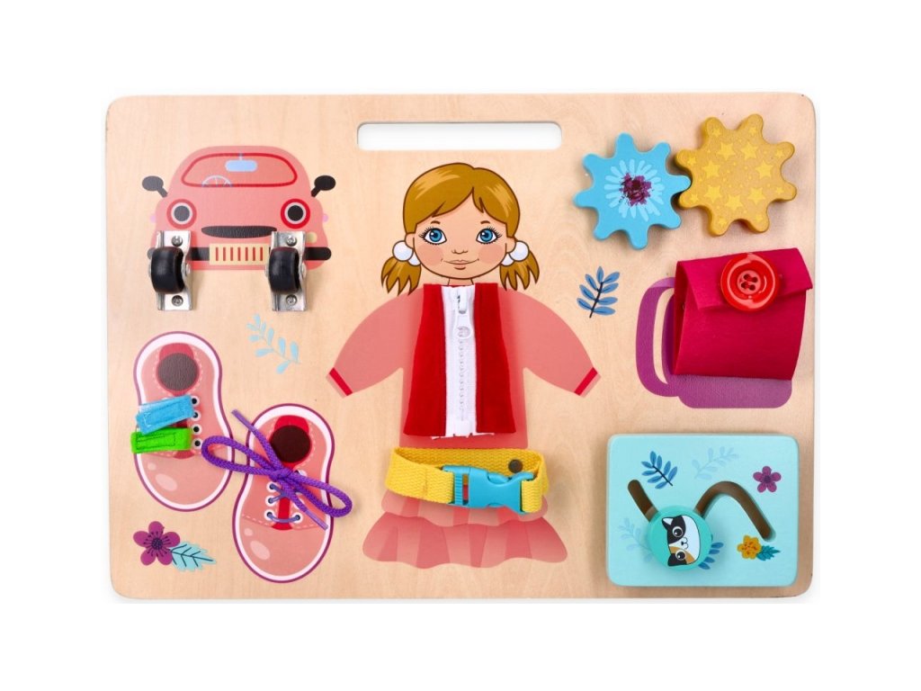 Drevená tabuľa je skvelou montessori pomôckou, ktorú možno pripevniť aj na stenu. Každý uzáver je iný, takže dieťa si zároveň trénuje logické myslenie, pretože musí prísť na to, ako s uzáverom pracovať. Táto montessori hračka je vhodná do domácnosti, materských škôl a montessori skupín. Okrem ružového motívu Aniky máme v ponuke aj modrú verziu s Adamom.