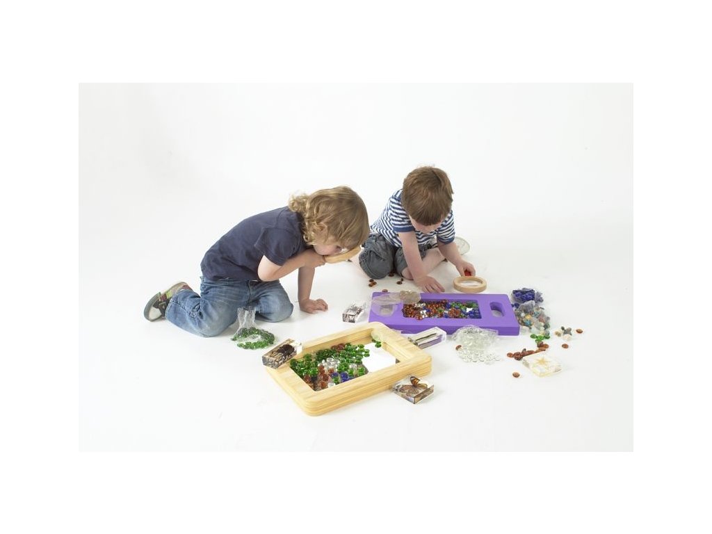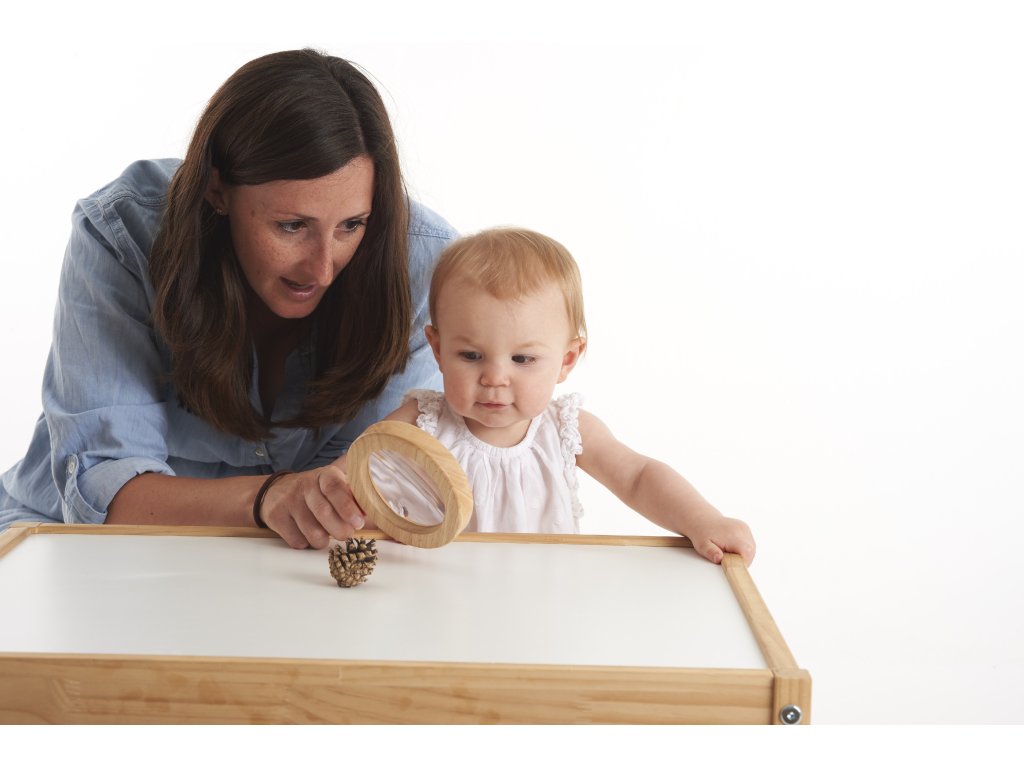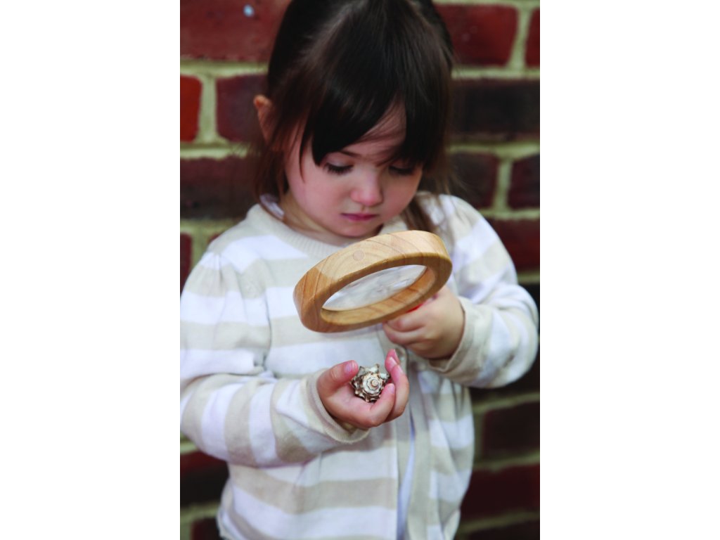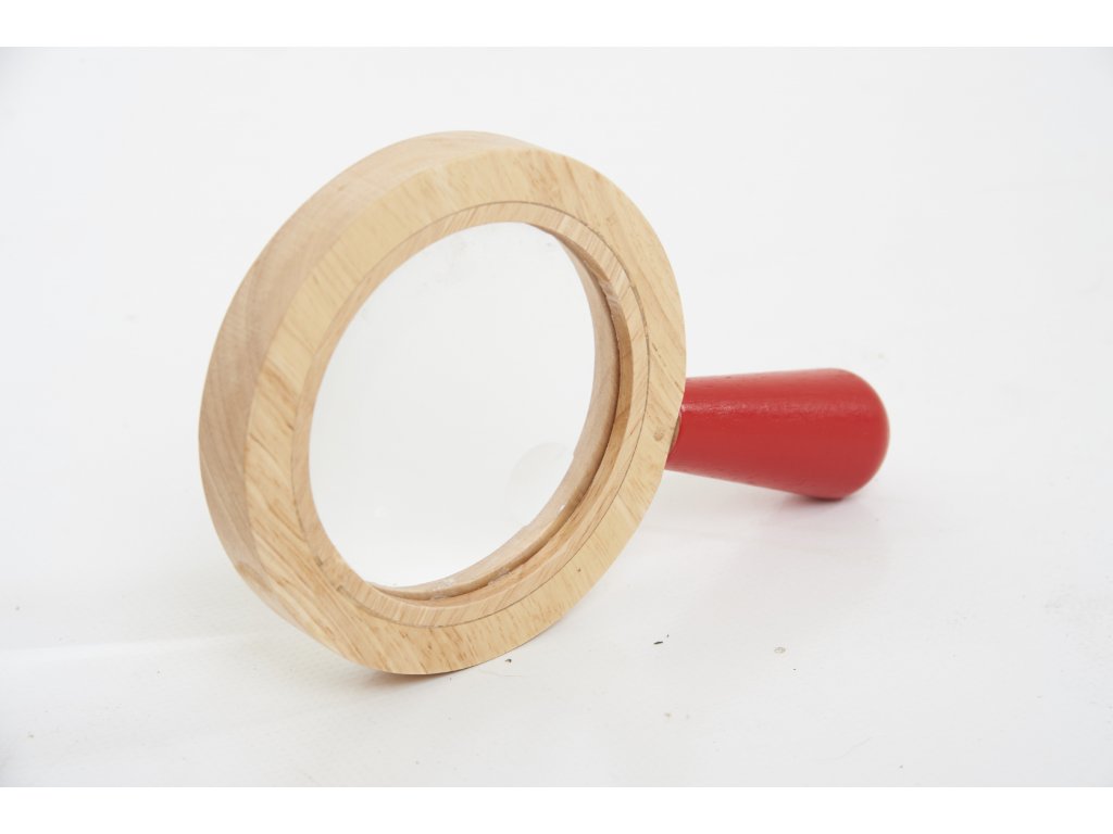 Drevená detská lupa s plastovou šošovkou s dvojitým zväčšením. Skvelá pomôcka na pozorovanie a skúmanie prírody a predmetov. Lupa má tiež vloženú šošovku s 3-násobným zväčšením a deťom sa ľahko drží. Preto je vhodná pre deti už od 1 roka.