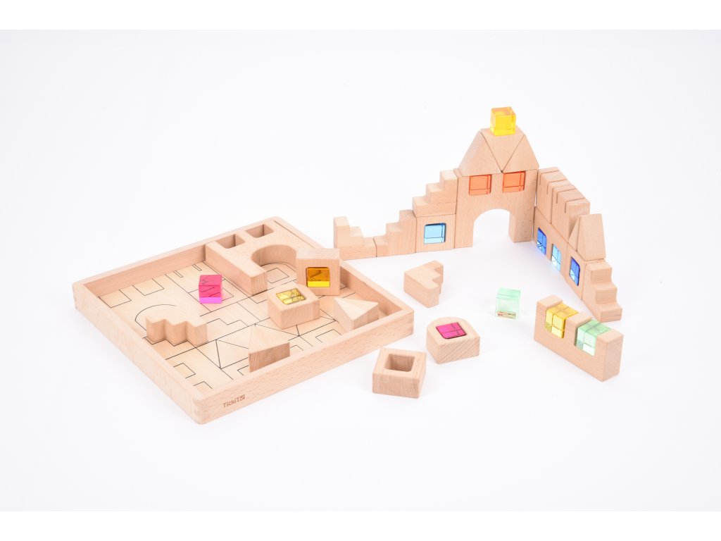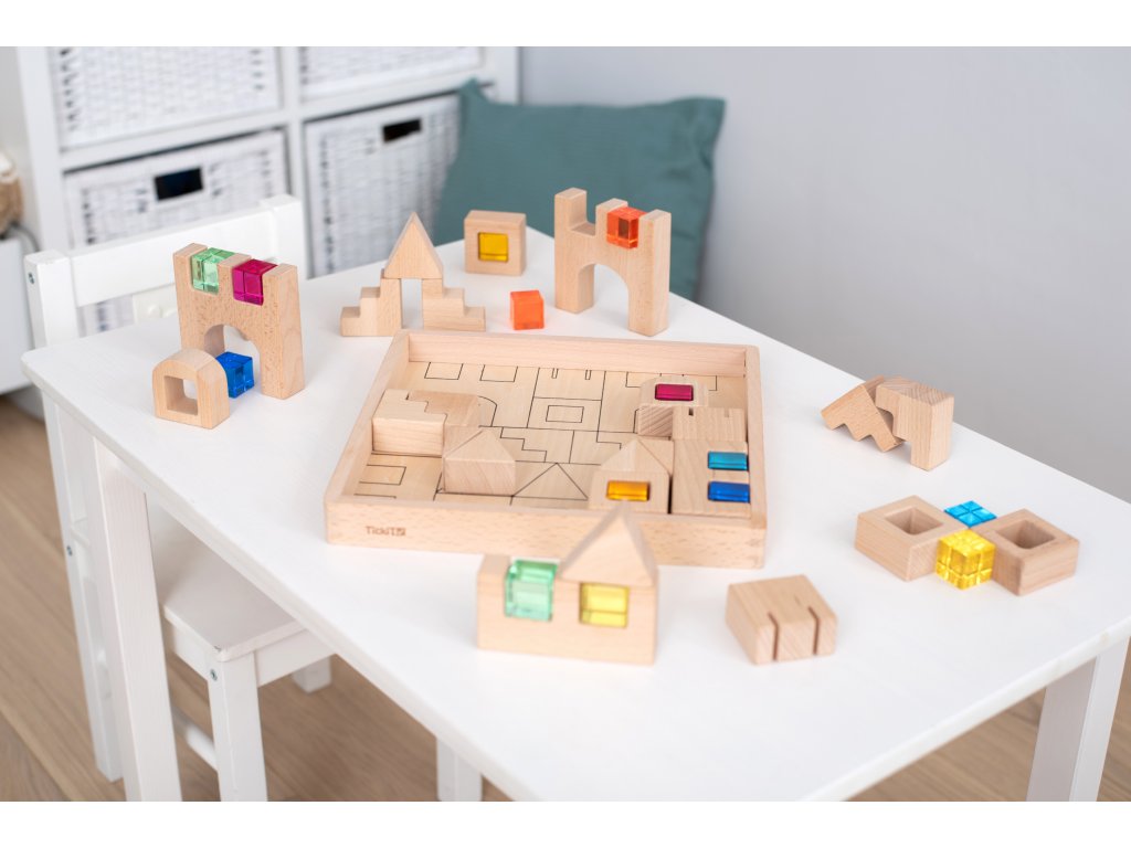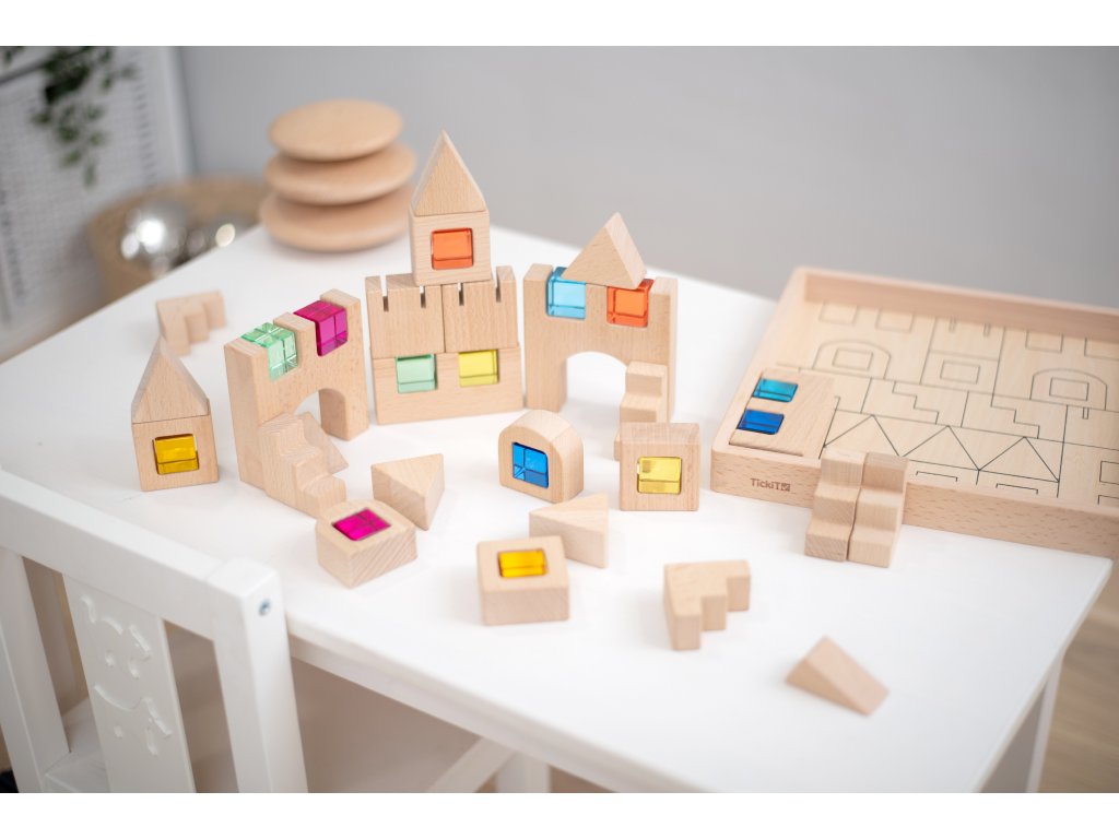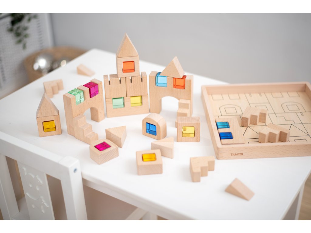 Neobvyklá stavebnica od anglickej značky TickiT, ktorá kombinuje kvalitné drevo a krištáľovo čisté farebné drahokamy. S touto nadčasovou súpravou si môžete postaviť zaujímavé stavby a navyše ich ozdobiť farebnými prvkami. Vďaka farbám je stavebnica zaujímavá aj pre menšie deti a môžete s ňou zábavnou formou skúmať tiene, odrazy svetla alebo sa učiť o farbách.