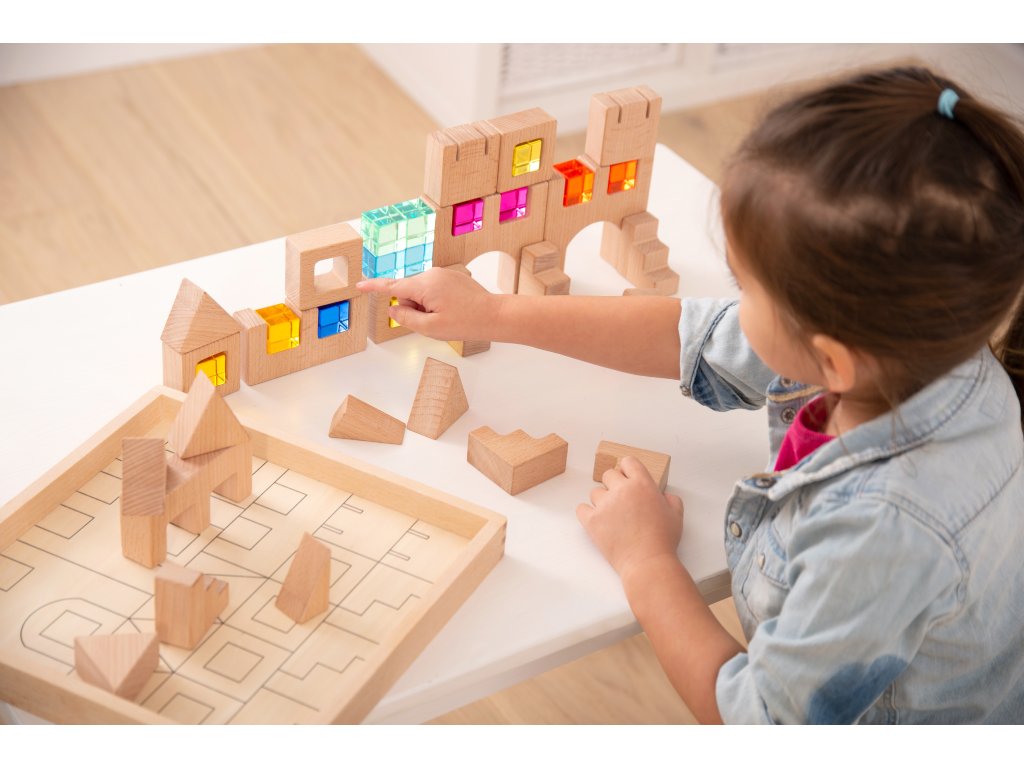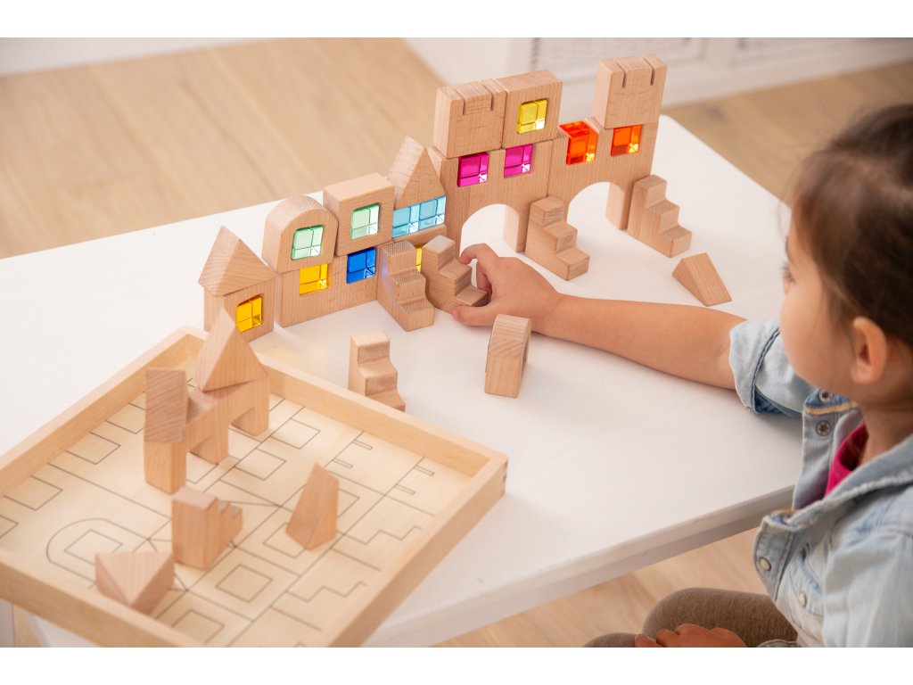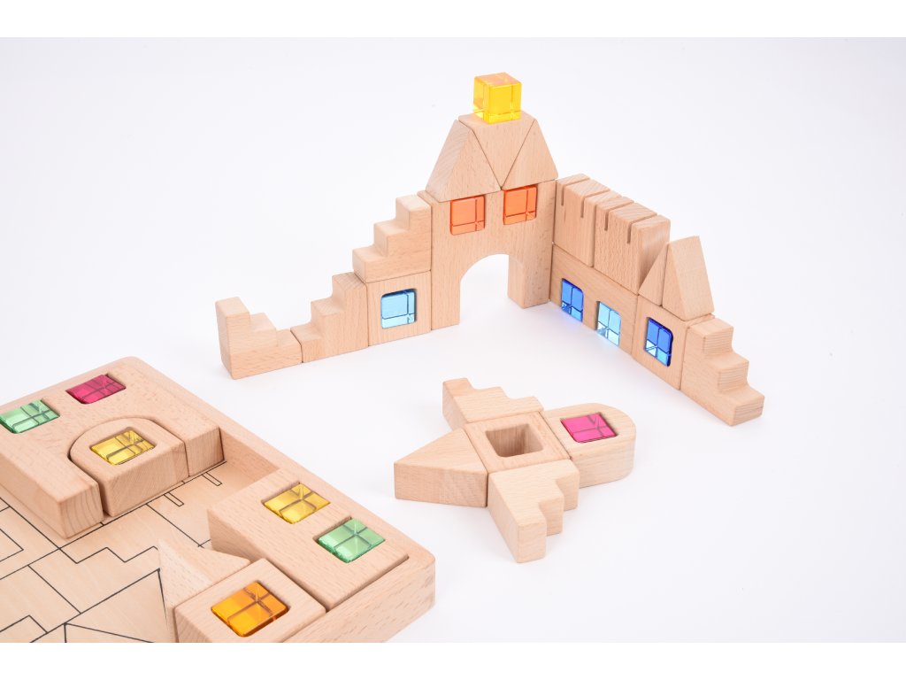 Kocky sú navrhnuté tak, aby boli štýlovo rôznorodé a podporovali kreatívne stavanie u starších detí a jednoduché zostavovanie u menších detí. Krásne farebné štvorčeky s drahokamami možno ľubovoľne vkladať do drevených dielikov a ľahko tak vytvárať zaujímavé farebné okná, dvere alebo dekorácie. Kocky sú vyrobené z kvalitného bukového dreva. Celá stavebnica je uložená v praktickej drevenej krabičke. Vhodné pre deti od 3 rokov.
