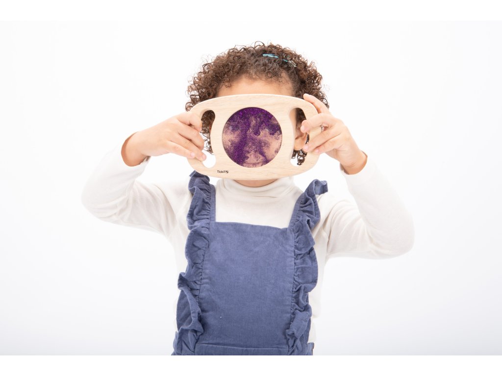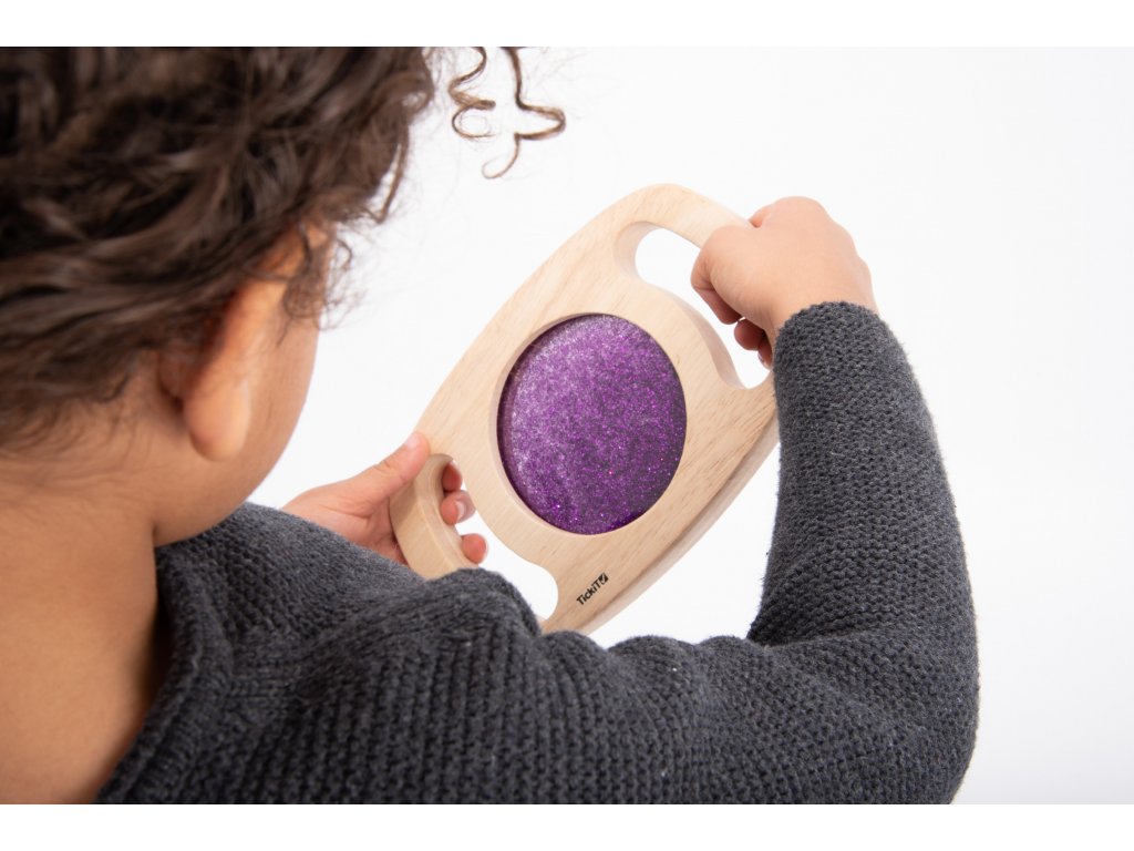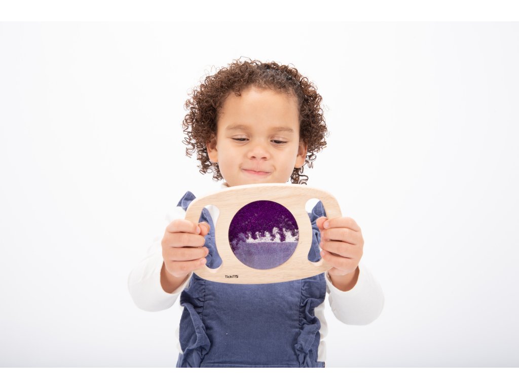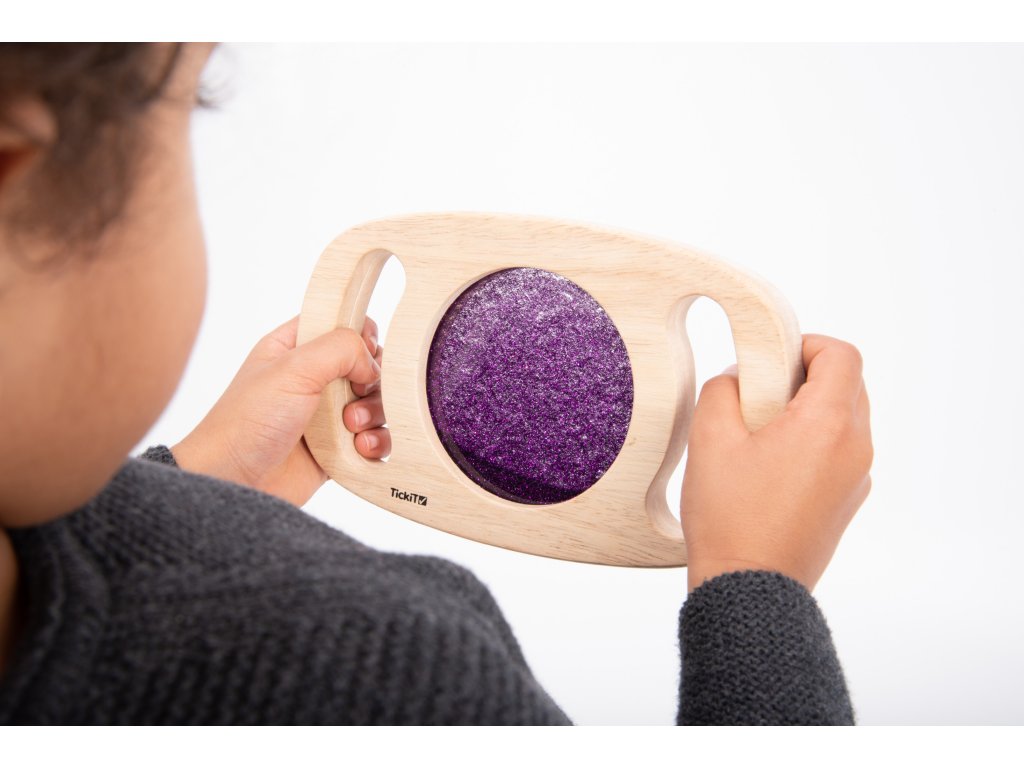 Svetlý panel s rámom z masívneho kaučukového dreva. Vďaka rukoväti sa deťom ľahko drží a otáča. Trblietavá tekutina vo fialovej farbe sa potom pohybuje a deti môžu fascinovane sledovať, ako sa prelieva. Ideálne na rozvoj motoriky, zmyslovú hru a pozorovanie. Okrem zlatej farby máme aj zlatý povrch. Vhodné pre deti od 1 roka.