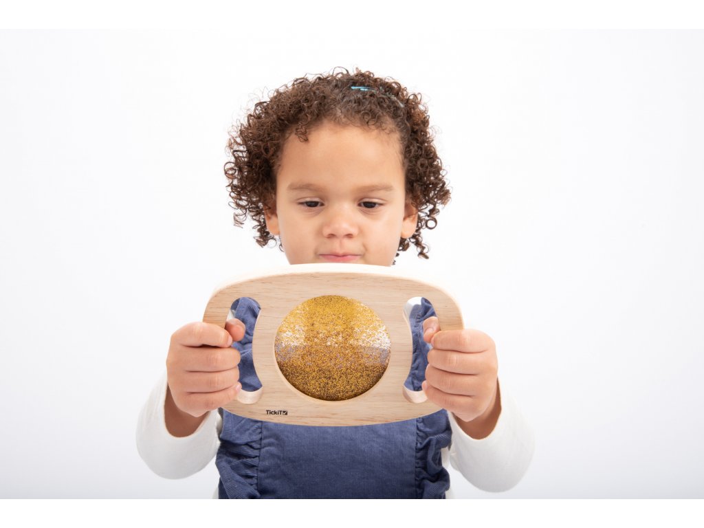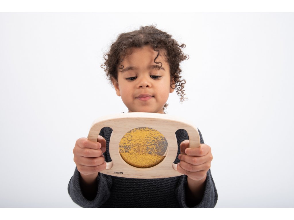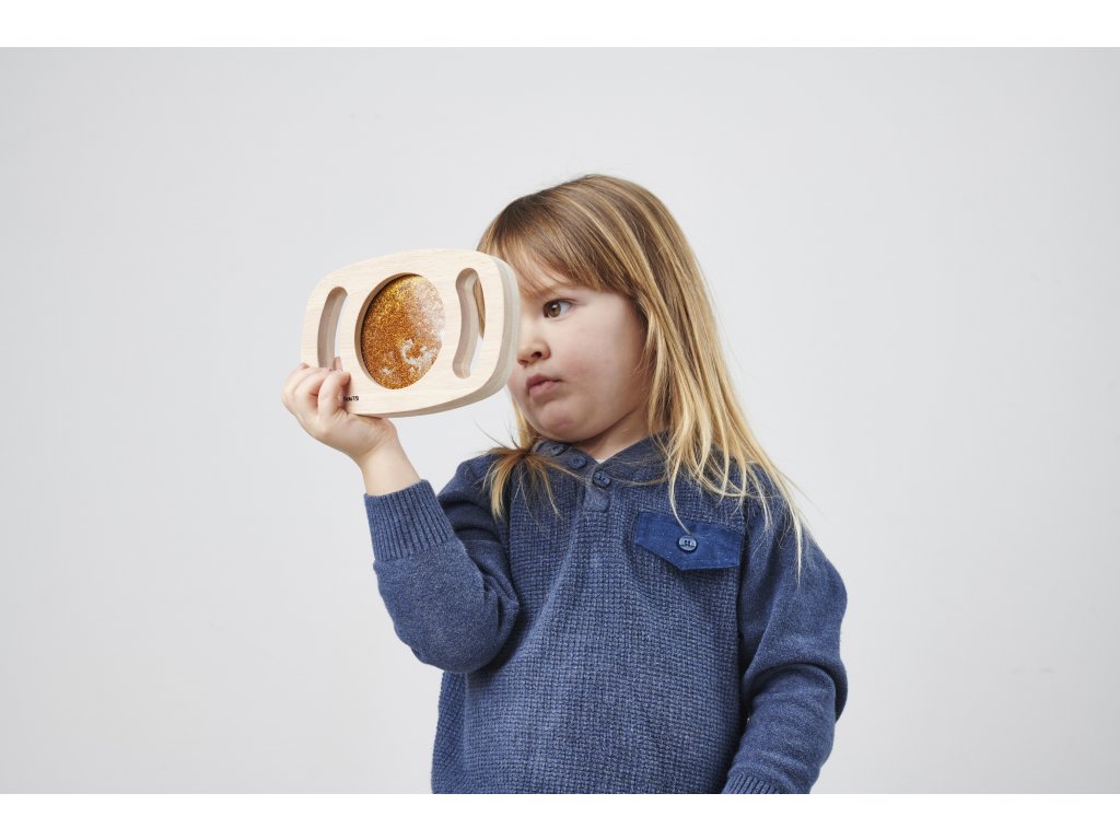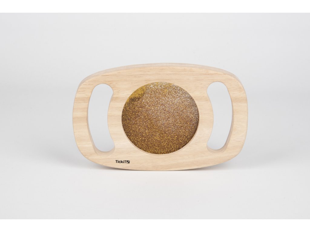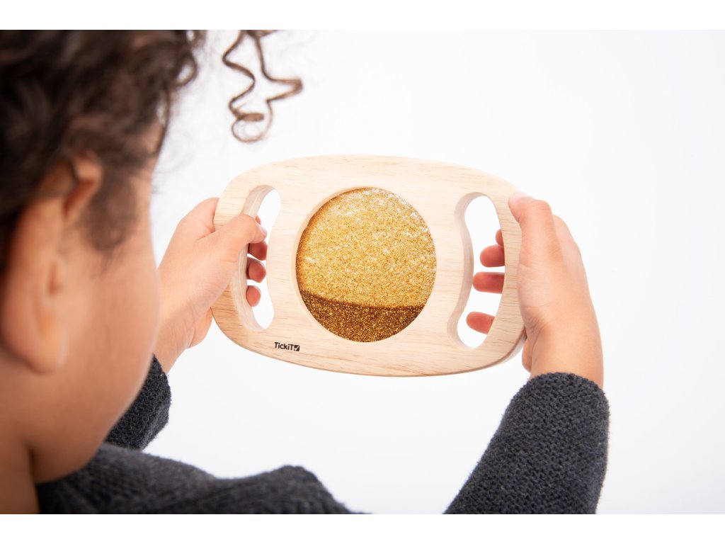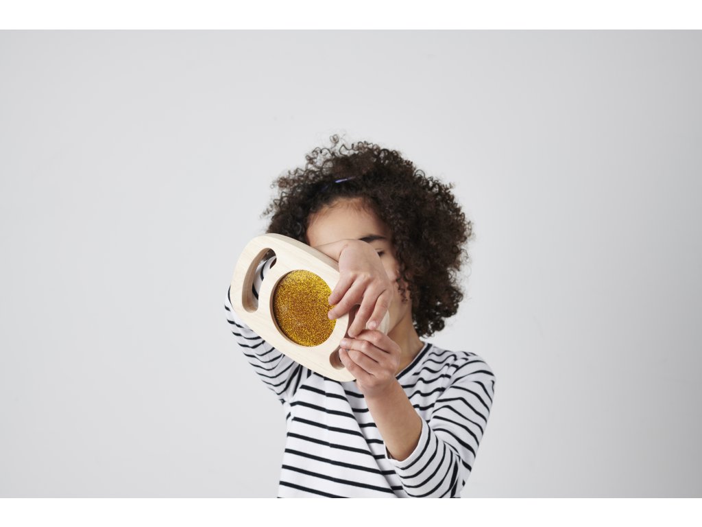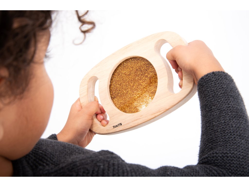Svetlý panel s rámom z masívneho kaučukového dreva. Vďaka rukoväti sa deťom ľahko drží a otáča. Trblietavá tekutina zlatej farby sa potom pohybuje a deti môžu fascinovane sledovať, ako sa prelieva. Ideálne na rozvoj motoriky, zmyslovú hru a pozorovanie. Okrem zlatej farby máme v ponuke aj fialovú úpravu. Vhodné pre deti od 1 roka.
