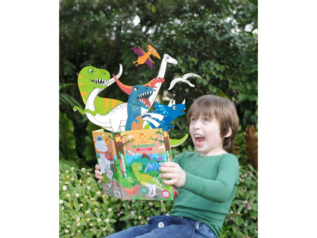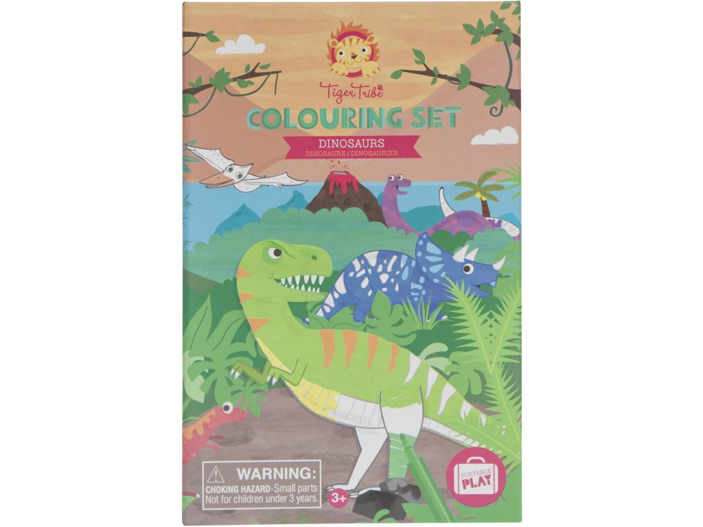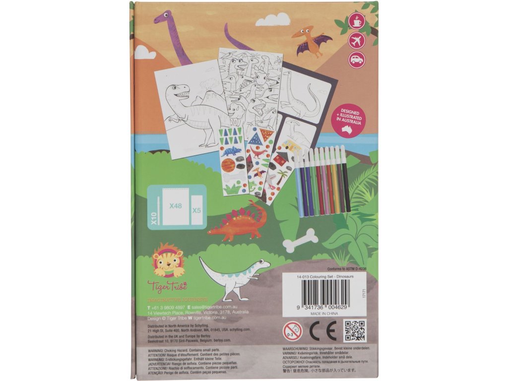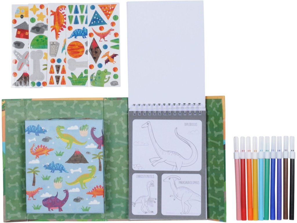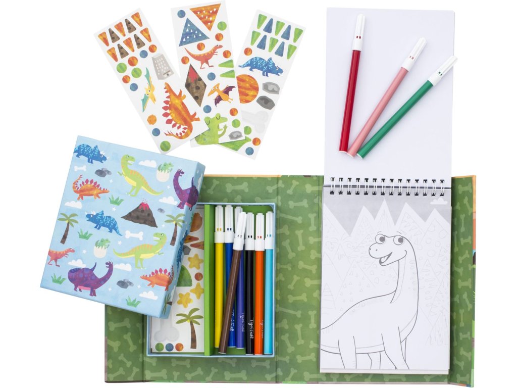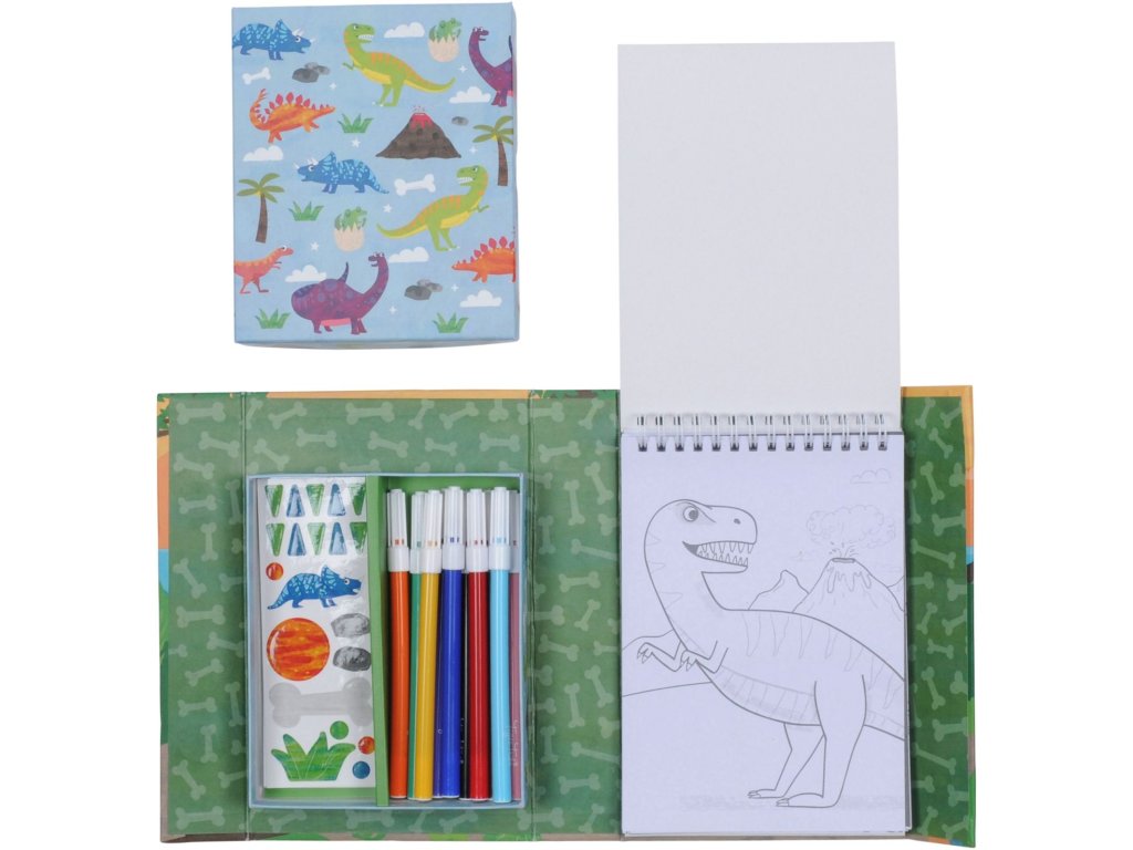 Vydajte sa na netradičnú cestu s dinosaurami. Zábavná kreatívna súprava Tiger Tribe pre deti obsahuje omaľovánku s motívom dinosaurov a fixky na kreslenie. K dispozícii sú aj samolepky, ktorými si deti môžu vyzdobiť svoje obrázky. Vďaka praktickej krabici, v ktorej nájdete všetko potrebné, je súprava vhodná aj na cesty (do lietadla, vlaku atď.). Stačí otvoriť krabicu, vybrať obrázok a zábava sa môže začať. Kreatívna súprava je vhodná pre deti od 3 rokov.