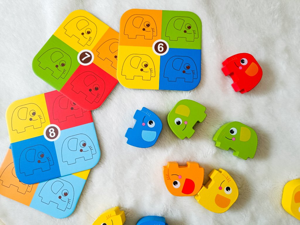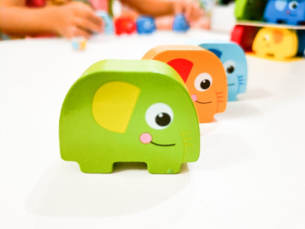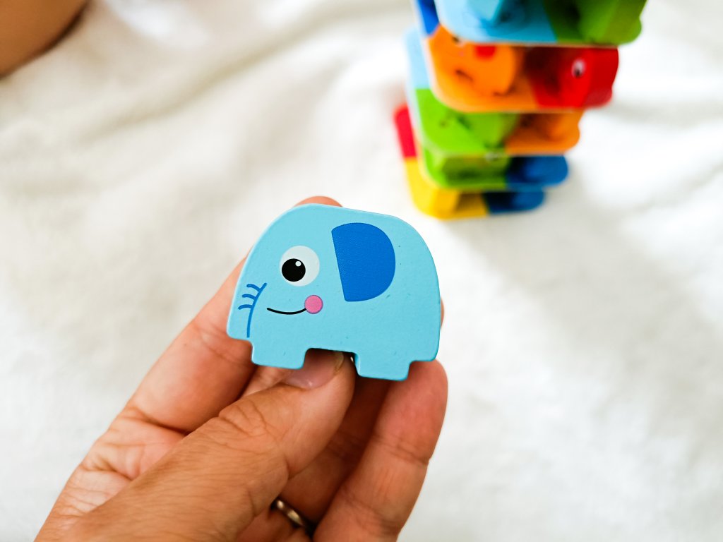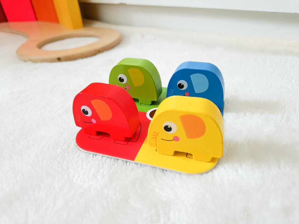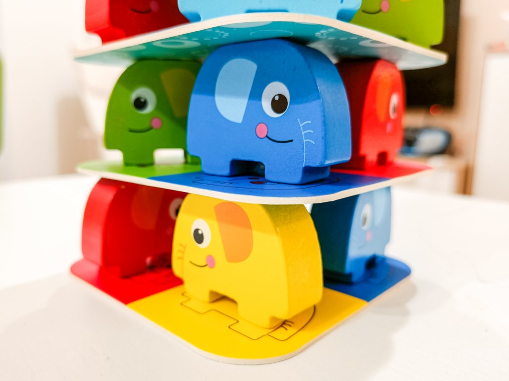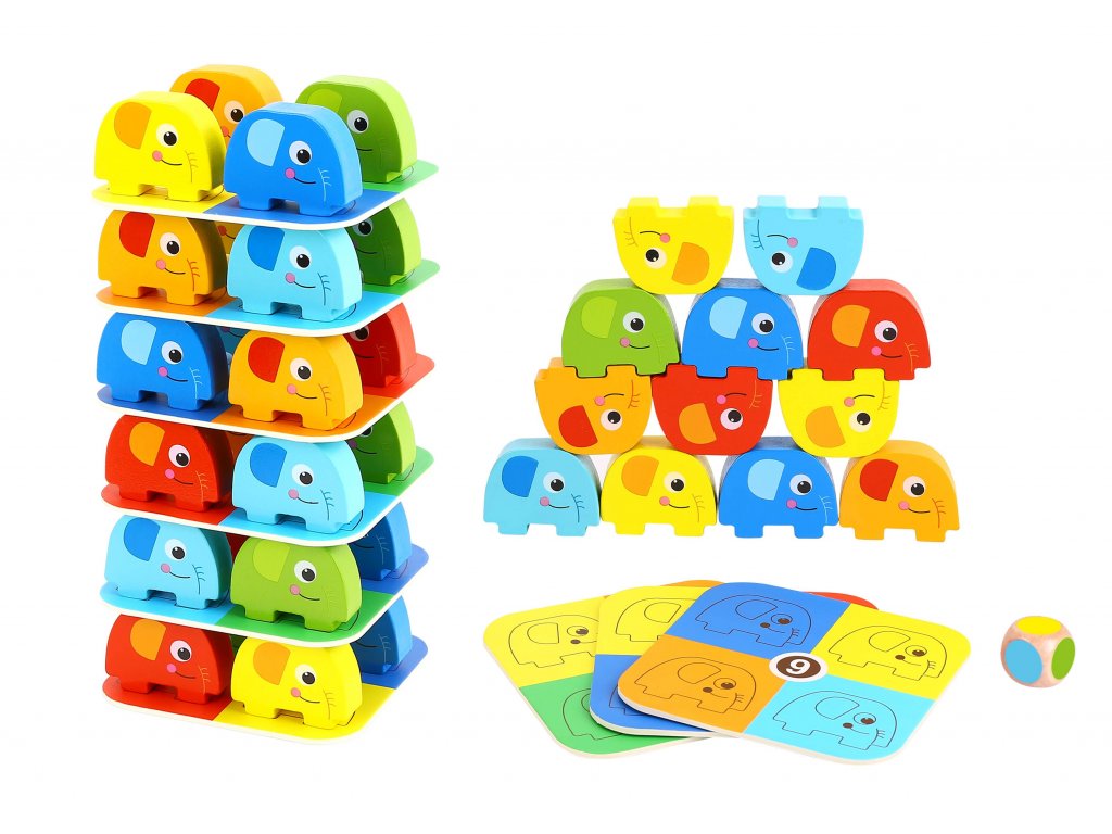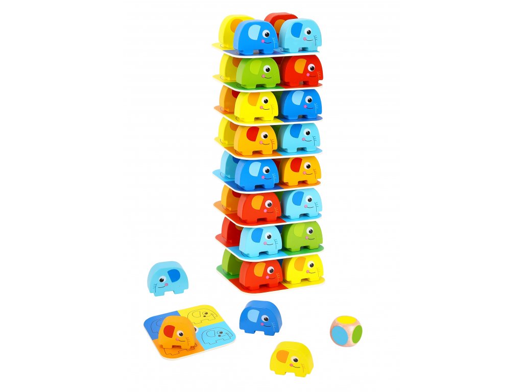 Balančná drevená hra so sloníkmi preverí koncentráciu a vizuálne schopnosti detí. Posilňuje tiež motorické zručnosti, kreatívne myslenie a rozpoznávanie farieb. Deti umiestňujú slony na seba na 9 očíslovaných kartičiek a potom hádžu kockou s farbami. Z veže musia vytiahnuť slona tej farby, ktorá padla na kocke. Kto zbúra vežu, prehráva.