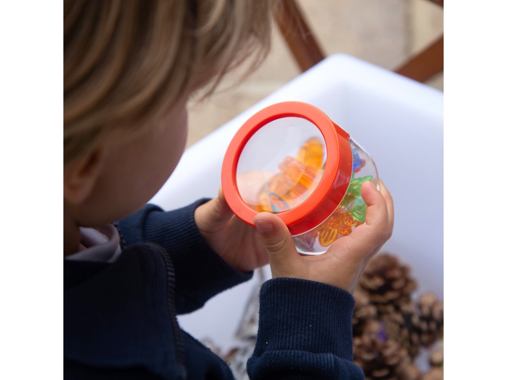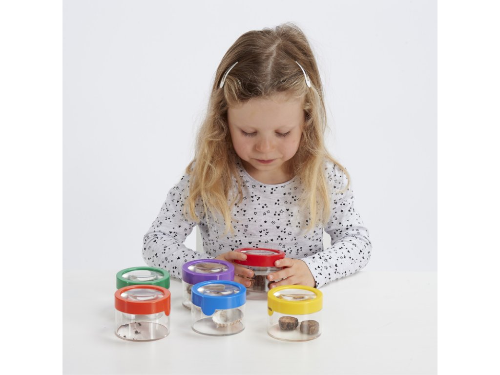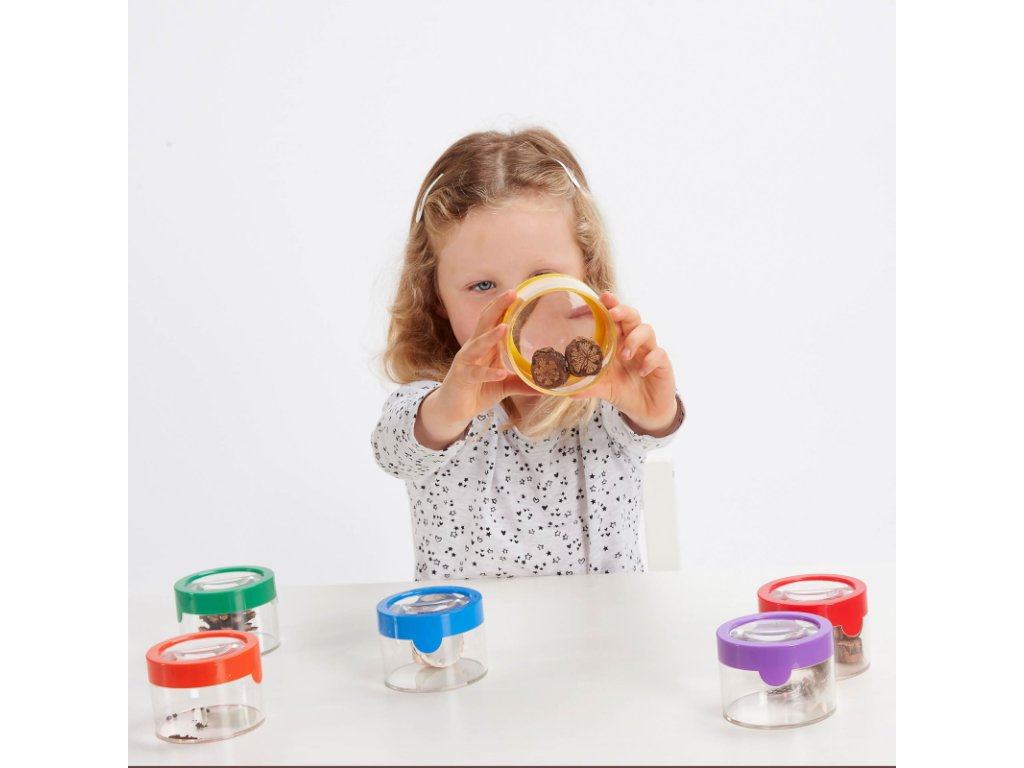 Barevné pozorovací nádobky jsou skvělou pomůckou do přírody, ale také na smyslohraní. Pozorujte broučky, kamínky, květiny nebo třeba barevné mušle. Nádoby můžete zakoupit po 1 kuse. Barvu zašleme dle dostupnosti (ale můžete uvést svou preferenci do poznámky - zelená, žlutá, červená, oranžová, modrá, fialová). Nebo můžete pořídit rovnou cenově výhodný set 6 pozorovacích nádobek a děti mohou najednou pozorovat více věcí. Nádobky můžete také doplnit o průsvitné barvené pinzety a duhové naběračky. Vhodné pro děti od 3 let.
