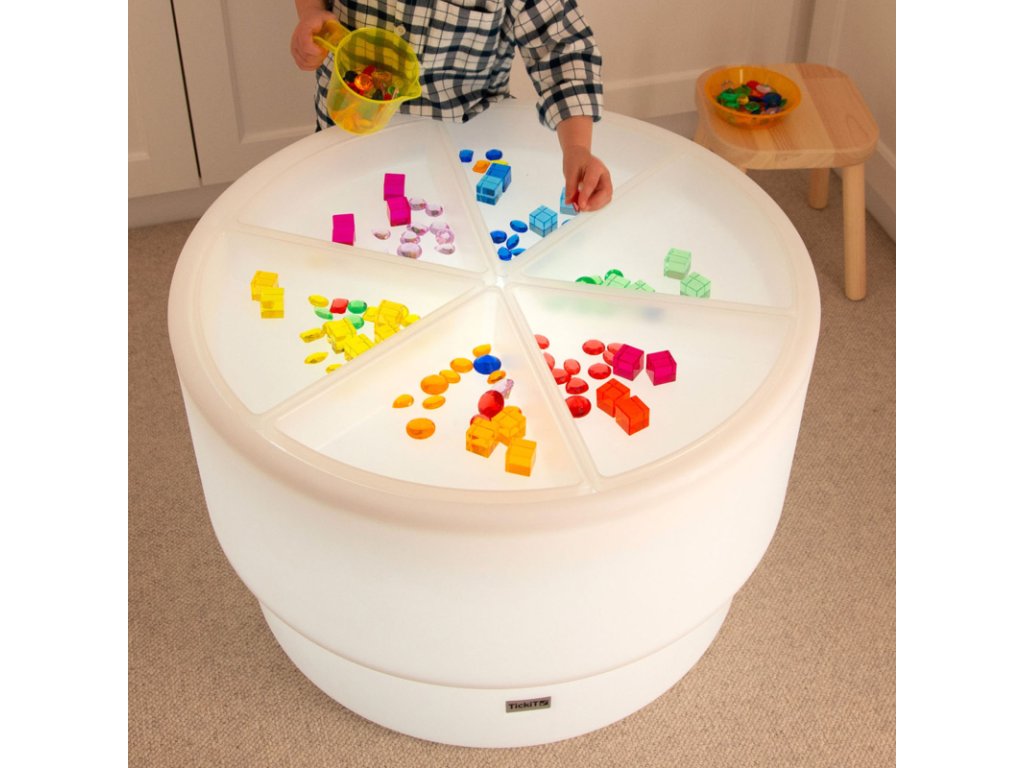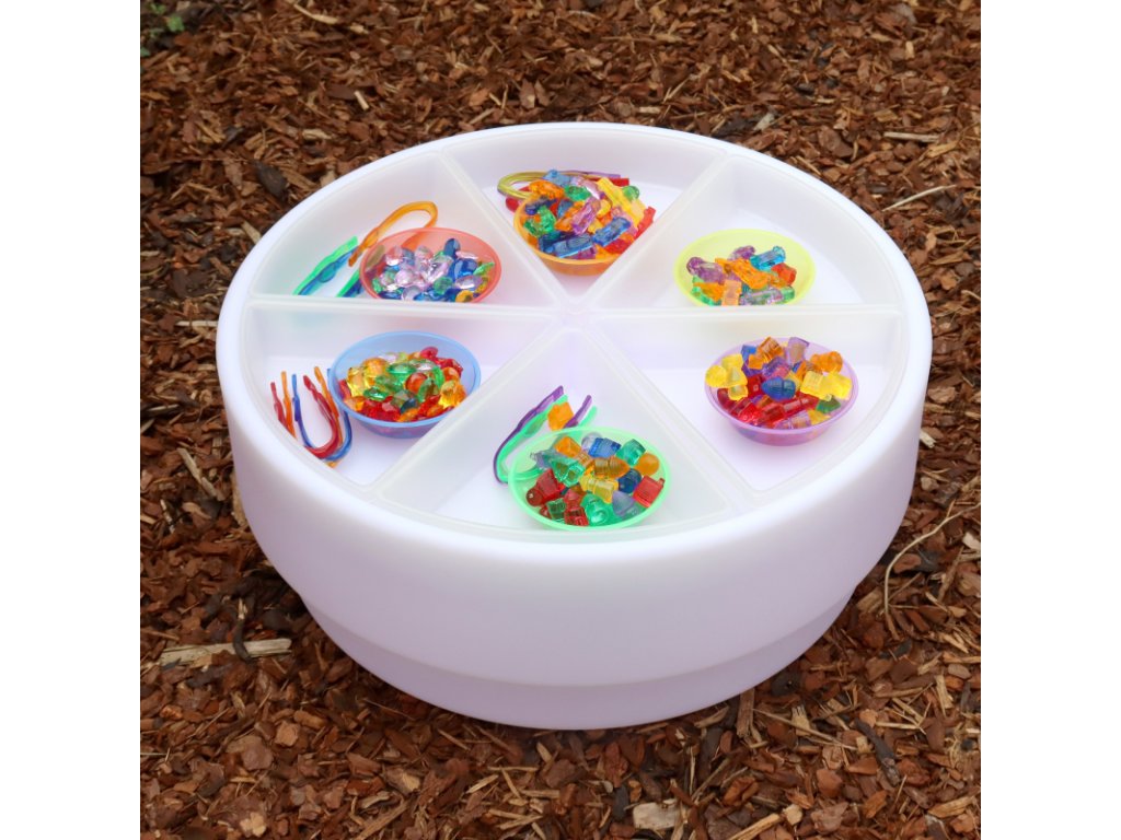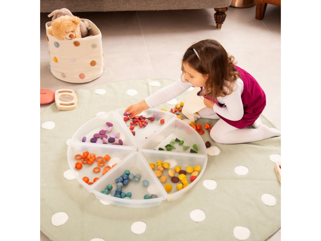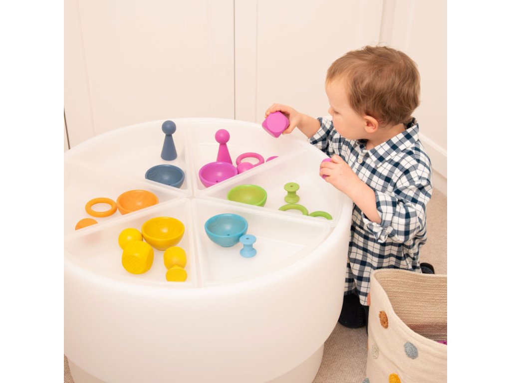 Odolné provedení umožňuje použití v interiéru i venku. Misky lze snadno přenášet, ukládat na sebe a kombinovat s dalšími smyslovými nebo vzdělávacími pomůckami. Jsou praktickým základem pro otevřenou hru, která roste spolu s dítětem. Misky navíc přesně padnou do kulatého světelného stolu TickiT, a to klasického i nízkého.