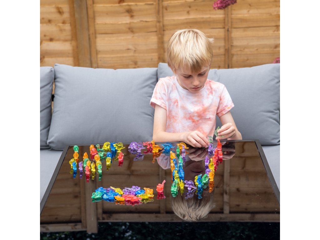 Barevné dinosaury TickiT využijete na počítání třídění, vytváření vzorů i trénink matematických dovedností (sčítání, odčítání, násobení aj.). Díky průsvitným barvám jsou ideální také na Tickit Ligh panel A3 a Tickit Ligh panel A2. Díky detailnímu zpracování mohou děti procvičit i hmat. A to nejen při hraní s panelem, ale také v rámci sensory play.