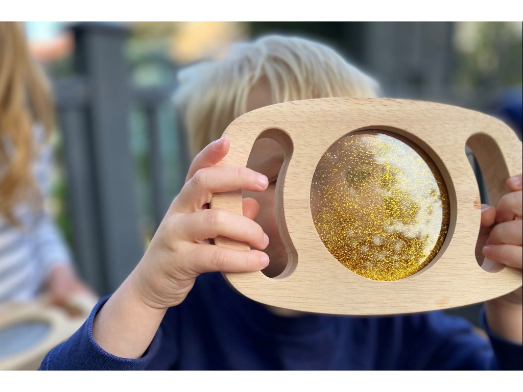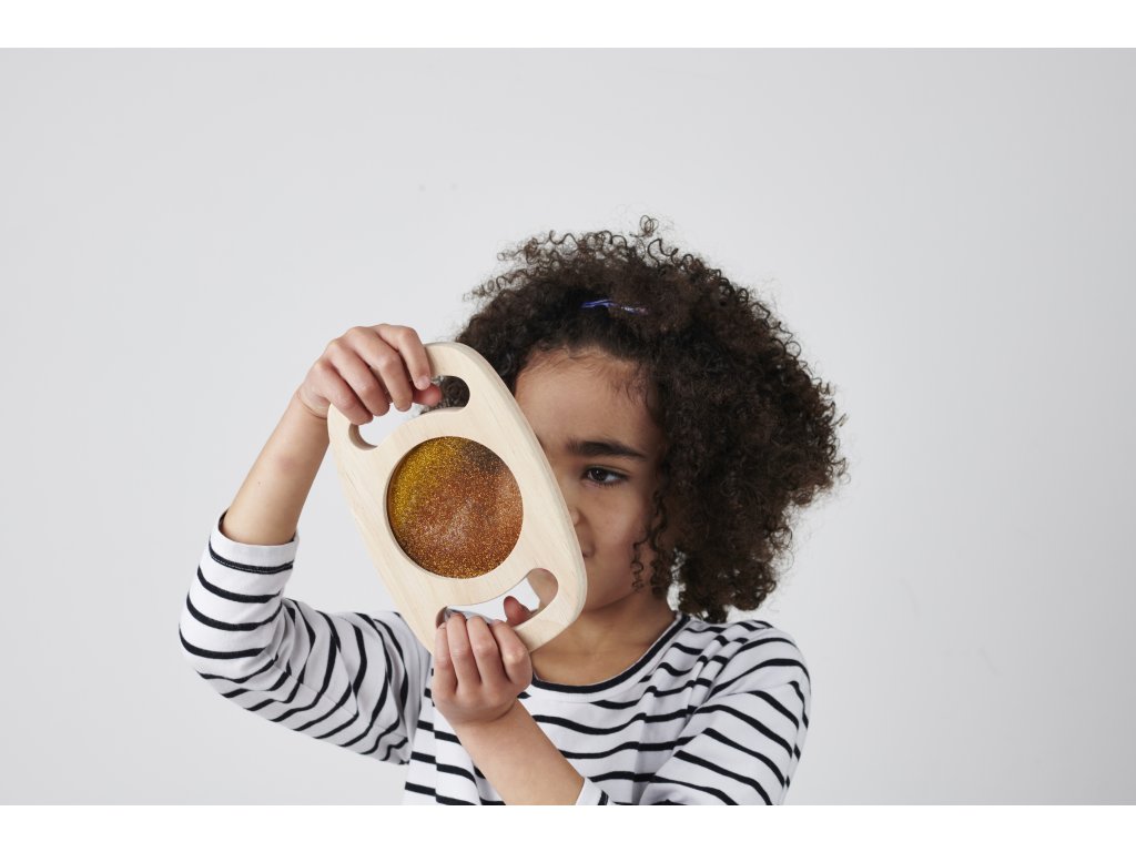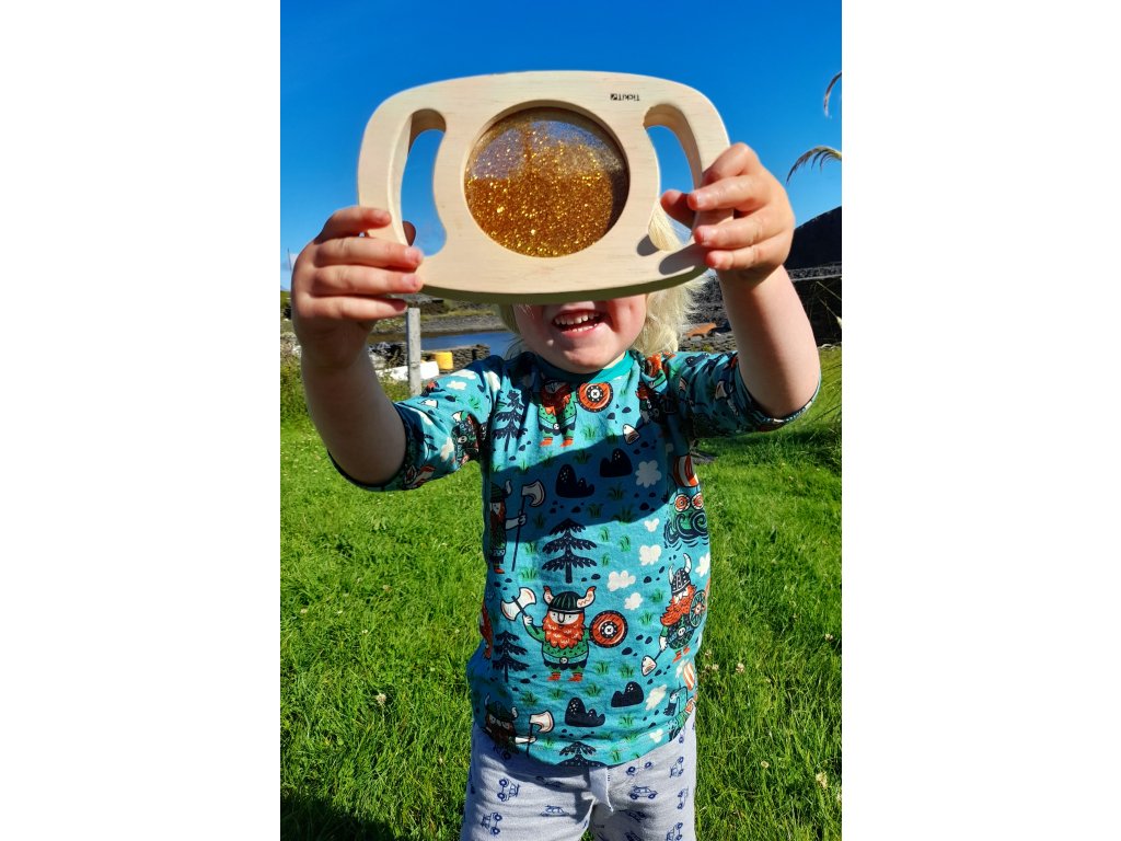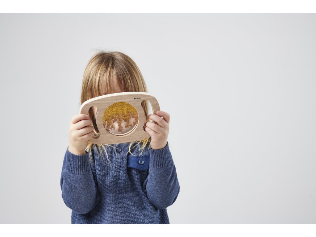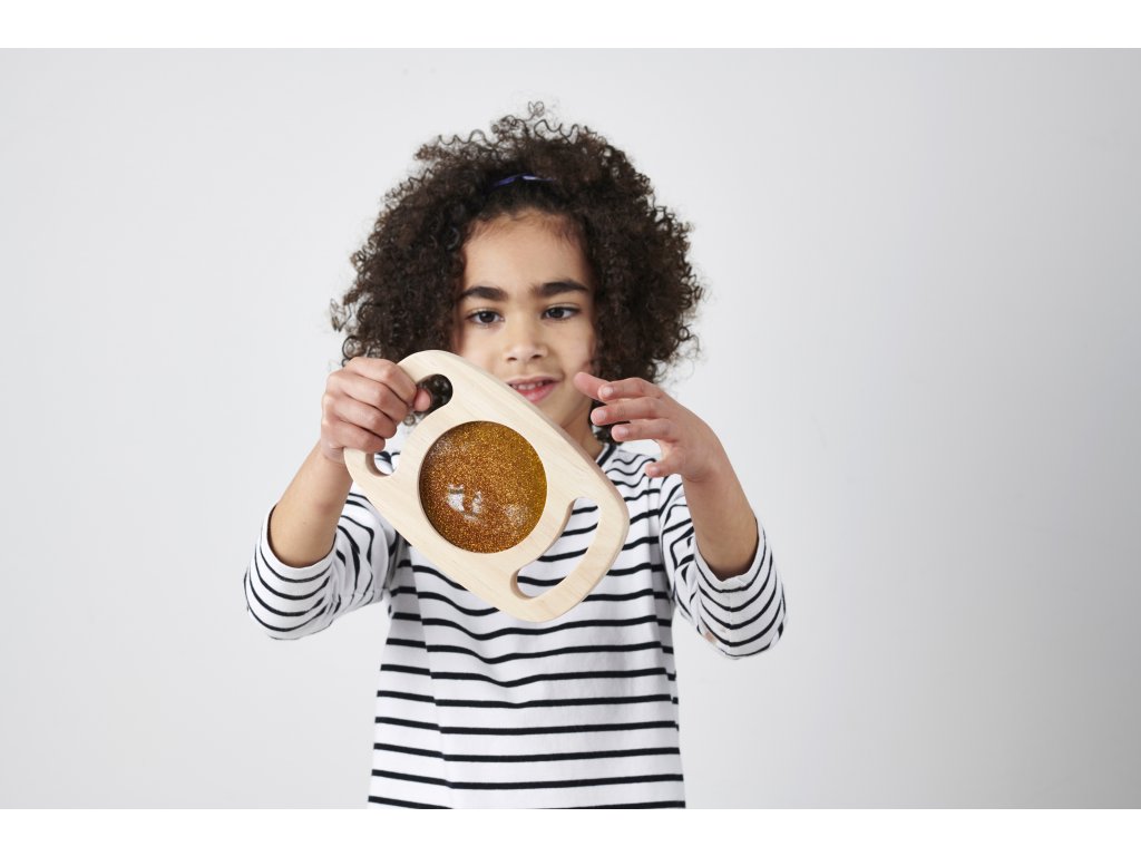 Zářivý panel s pevným rámem z kaučukového dřeva. Díky rukojeti se dětem dobře drží a mohou ho snadno přetáčet. Třpytivá kapalina ve zlaté barvě se pak pohybuje a děti mohou fascinovaně sledovat, jak se přelévá. Ideální pro rozvoj motoriky, smyslové hraní a pozorování. Kromě zlaté barvy máme také fialové zpracování. Vhodné pro děti už od 1 roku.