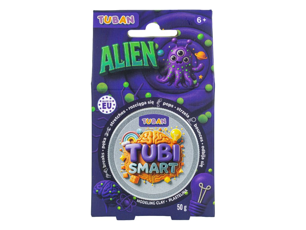 Tubi Smart modelovací hmota Alien přináší dětem zábavný fialový odstín a další rozměr kreativního tvoření. Do hmoty lze přidat žluté pěnové kuličky, které změní její strukturu a dodají hře nový smyslový zážitek. Hmota se natahuje, praská a lehce odskakuje, takže každé zmáčknutí překvapí jiným efektem.