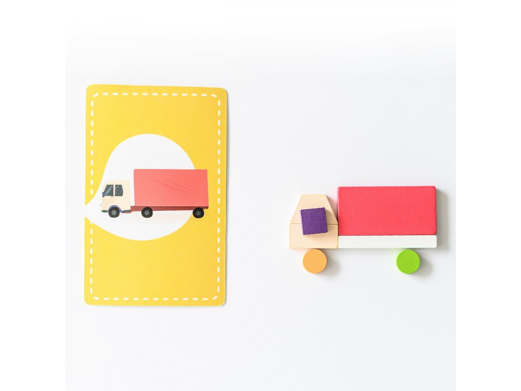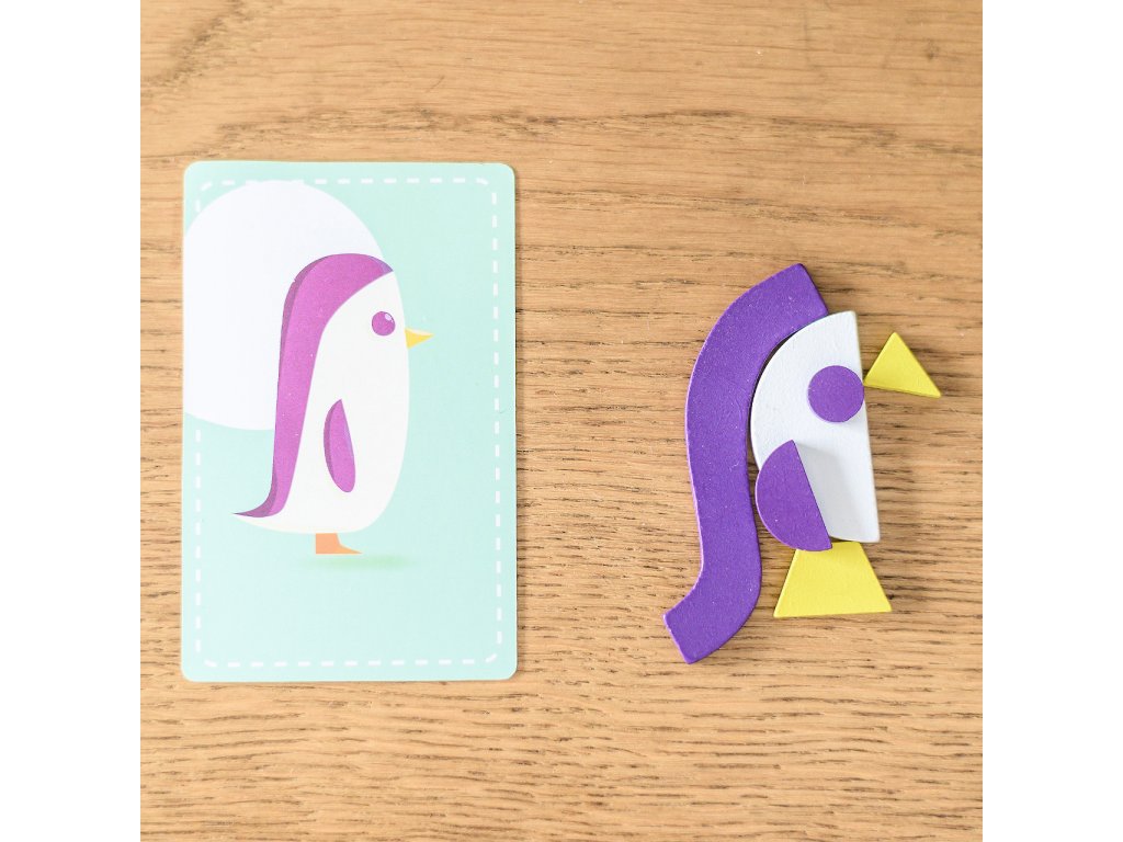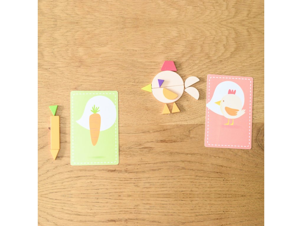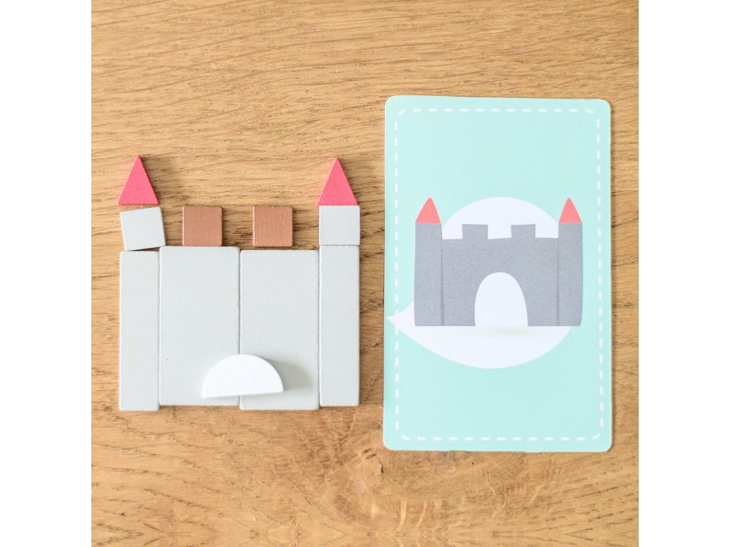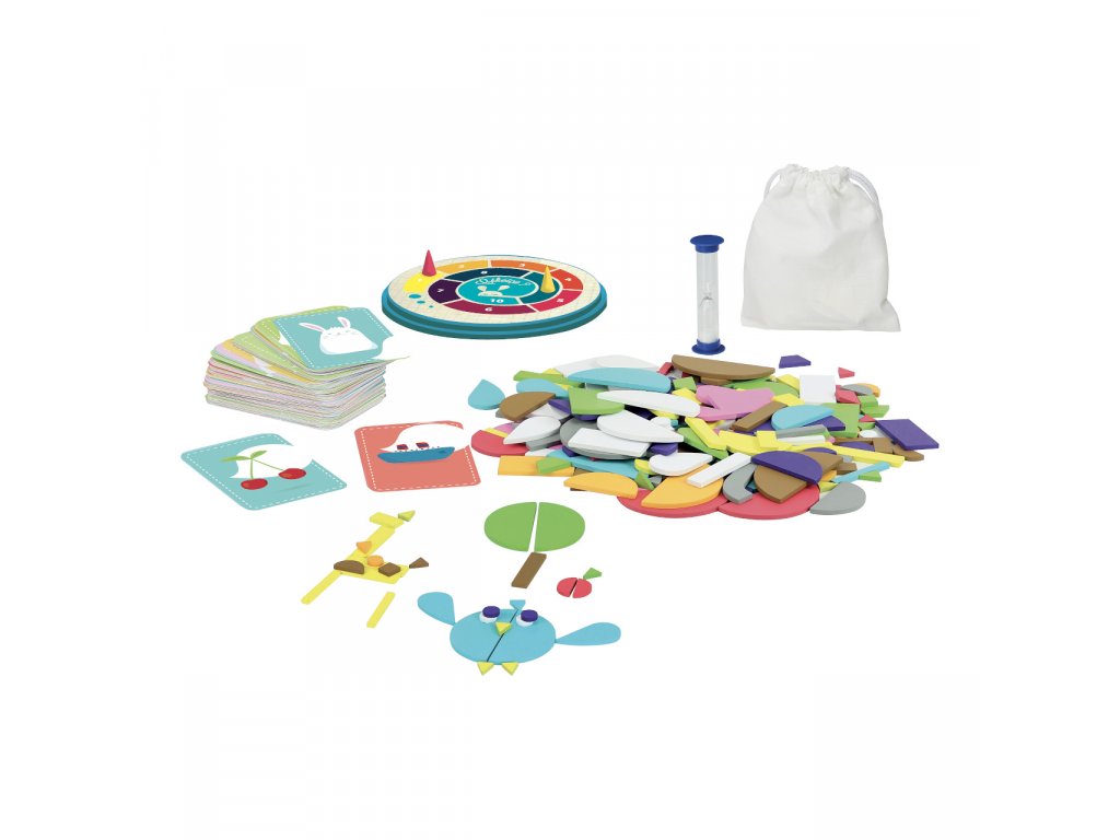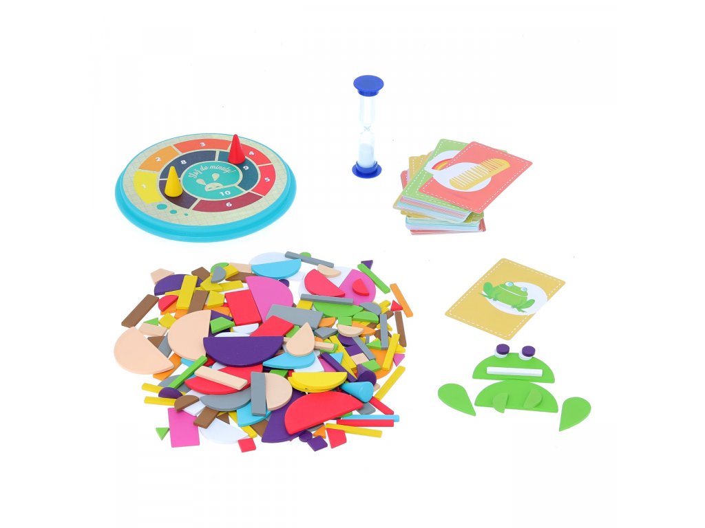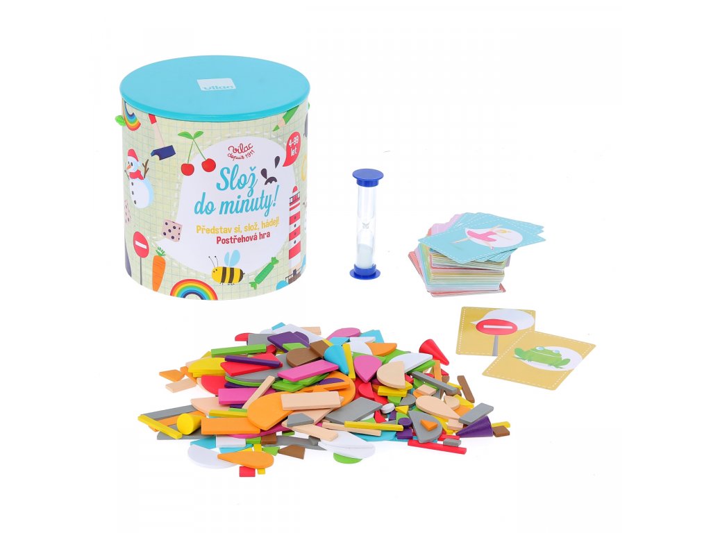 Zábavná společenská hra, která rozvíjí dětskou představivost a postřeh. Postup je přitom jednoduchý - stačí si vzít kartičku a z dostupných tvarů se snažíte poskládat do minuty obrázek. Podaří se vám to? Hra se dá také snadno přizpůsobit věku a schopnostem dítěte - můžete například zkrátit časový limit nebo hrát úplně bez něj. Můžete předem vybrat pár dřevěných kostek nebo hrát se všemi.