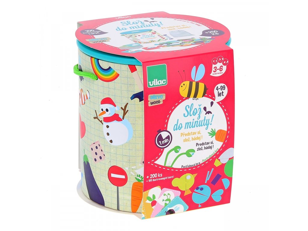 Společenská hra Slož do minuty od Vilac je dodáváná v praktickém kartonovém kylbíku, stejně jako oblíbené hry Hmatej a najdi. Kyblík má český potisk a najdete v něm čaké český a slovenský návod. Vhodné pro děti od 4 let.